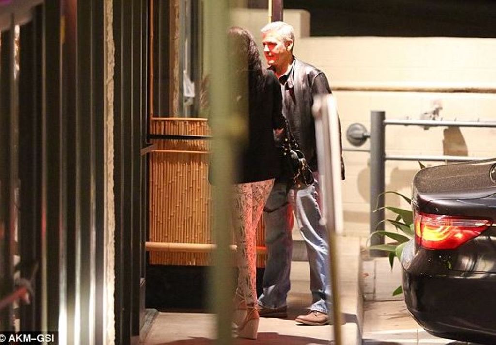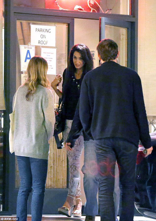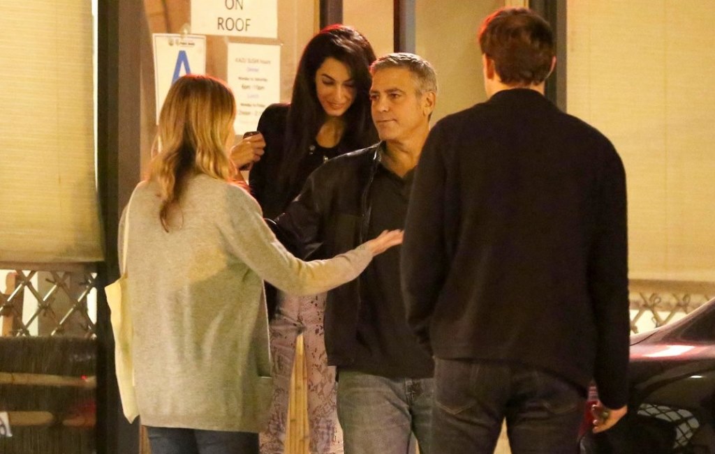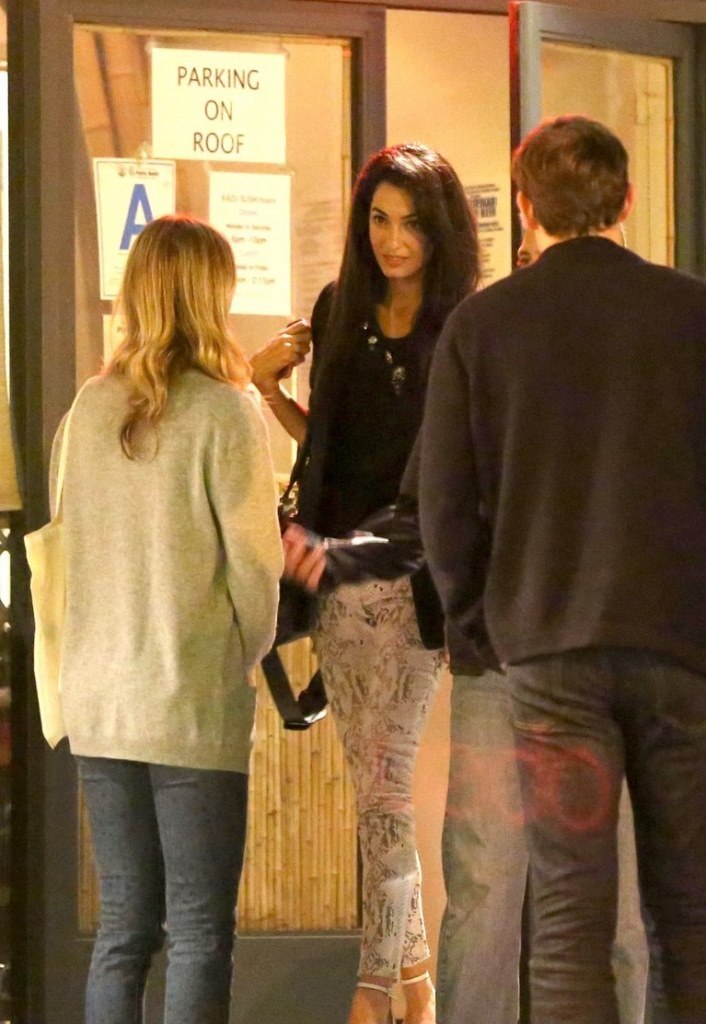 ikat3   Amal Alamuddin and George Clooney go on a double date with Emily Blunt and husband John Krasinski on Thursday evening (March 27) in Hollywood. As the two couples left the restaurant, they all spent some time saying goodbye before heading to their respective cars. Amal wore a printed jeans with black jacket and bag and beige sandals wedges. The jeans are by 7 for All Mankind The Skinny in White with High Gloss. With big thanks to the http://www.eclecticstyleblog.com/ for the ID !