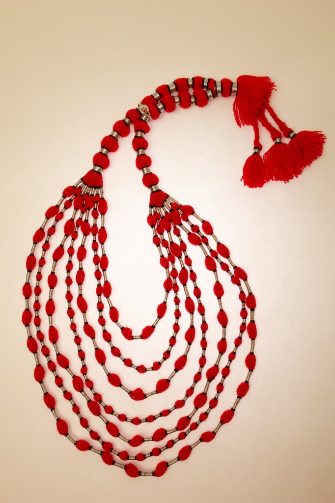 This exquisite hand crafted necklace is a solid red 7 layer vibrant vermillion with a two way necklace with silver accents and a peacock fastener.
