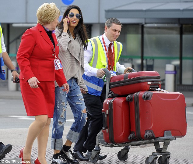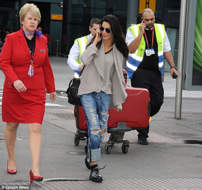 Amal Alamuddin beamed at Heathrow Airport in London on Tuesday after flying in from Las Vegas. The pair had been celebrating their engagement Sunday in Malibu, California.