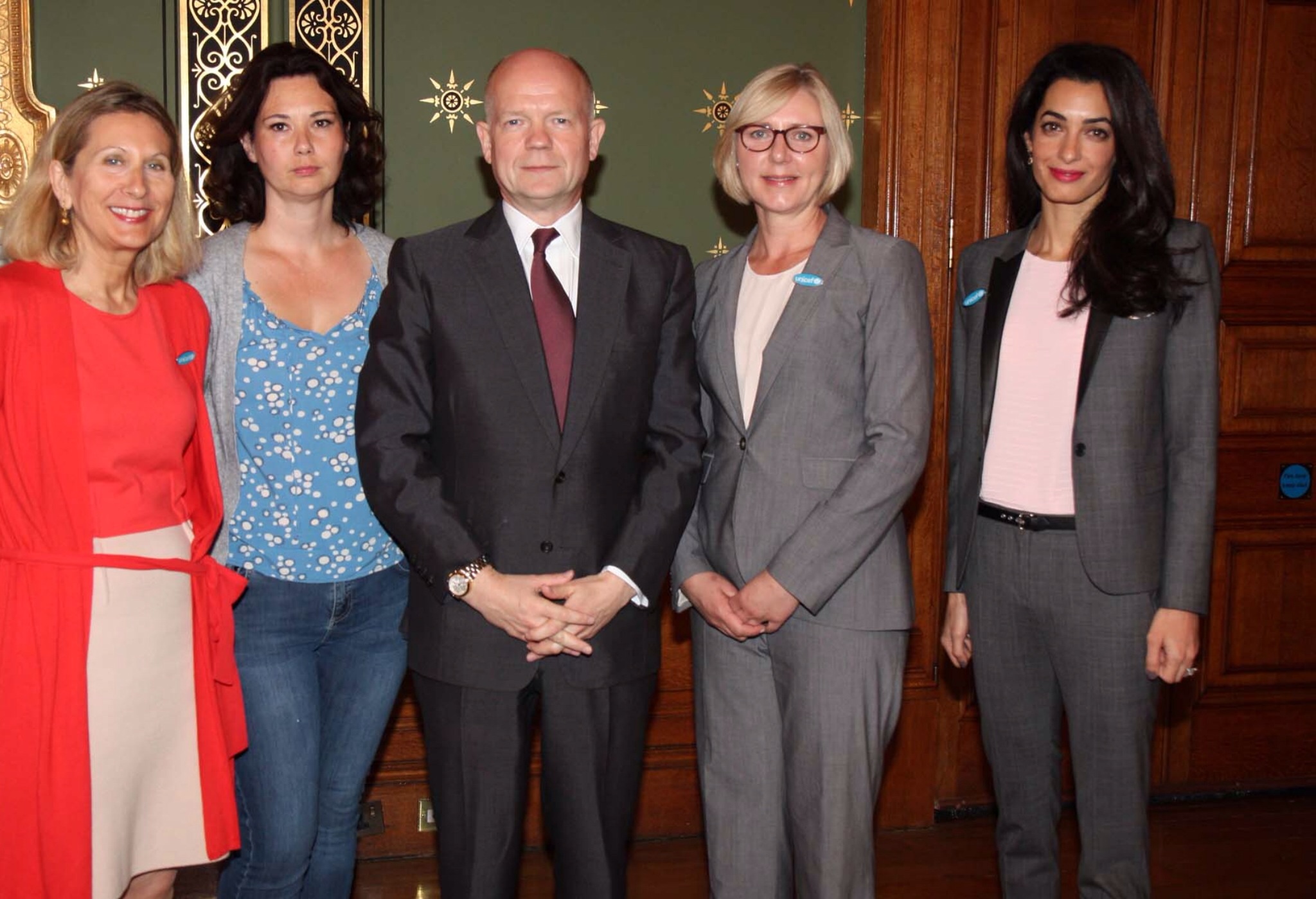 Picture: Professor Geraldine Van Bueren QC, Mumsnet Campaign Manager Rowan Davies, Foreign Secretary William Hague,Député Executive Director of UNICEF UK Anita Tiessen and barrister Amal Alamuddin. Courtesy of UNICEFild survivors to come forward and access the justice they deserve.”