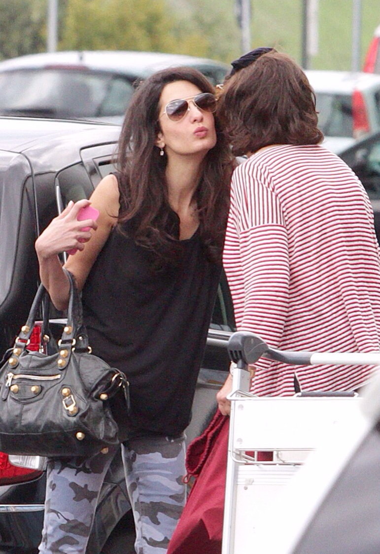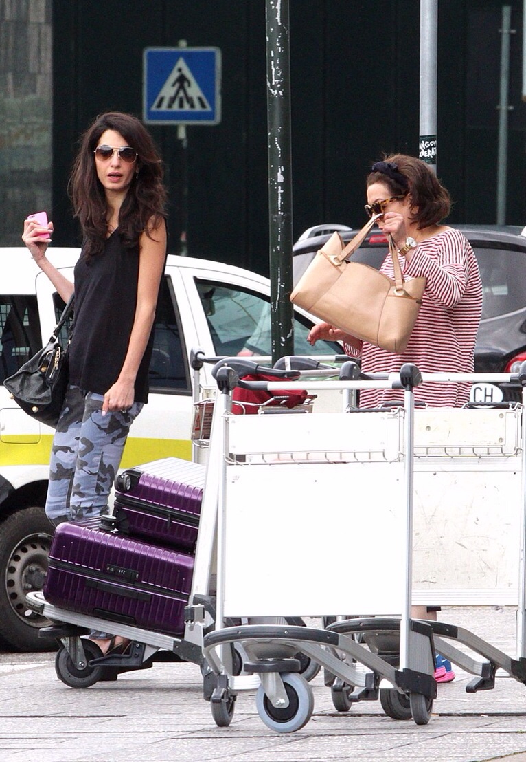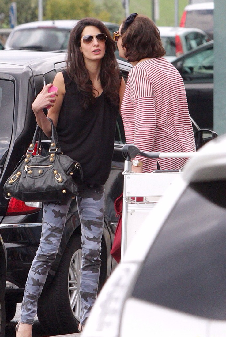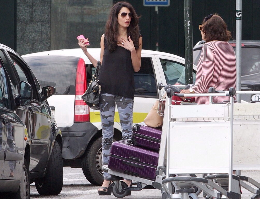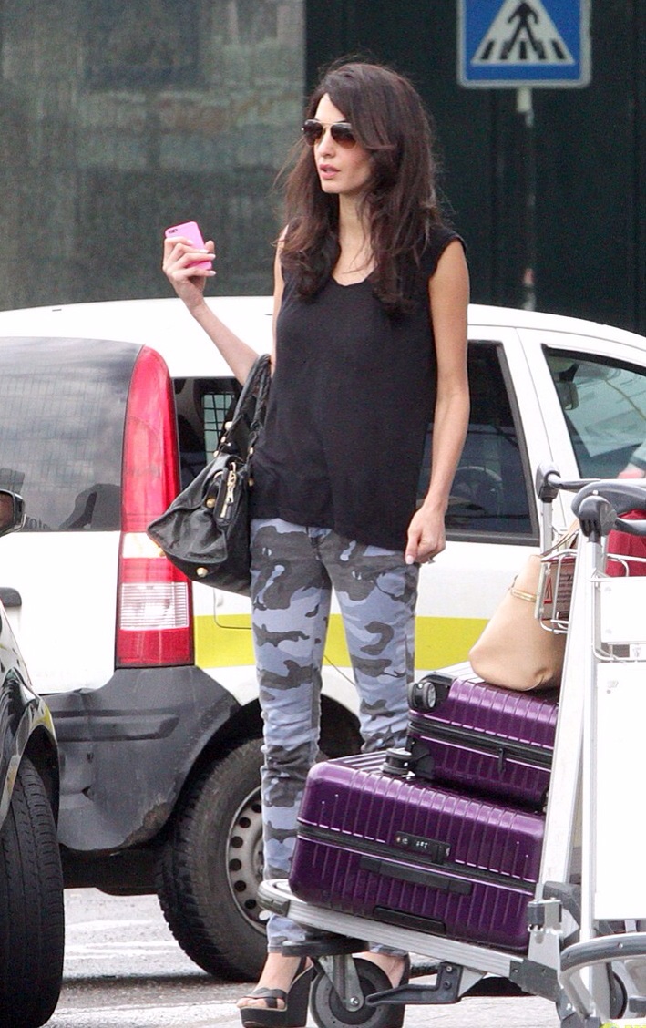 Amal Alamuddin dons a chic pair of camouflage pants while arriving at the airport on Friday (August 1) in Milan, Italy.