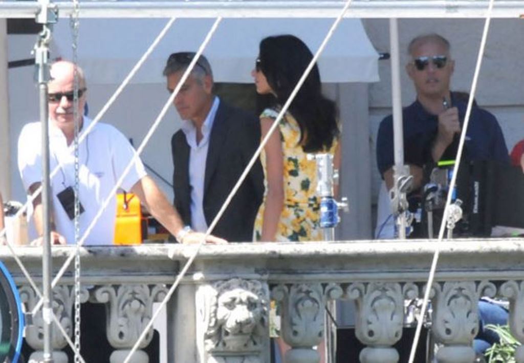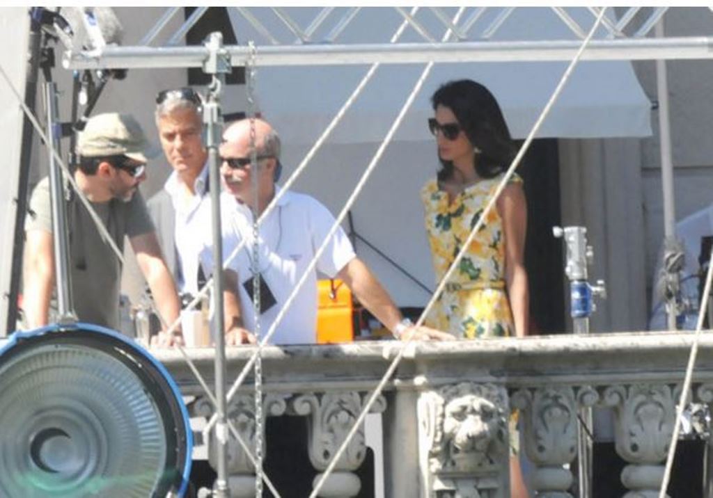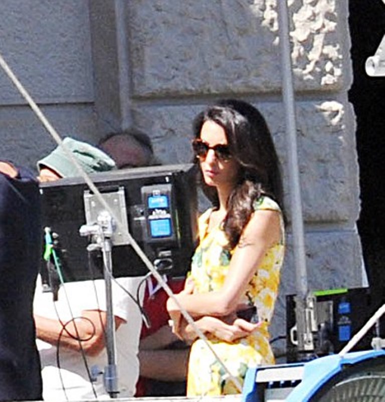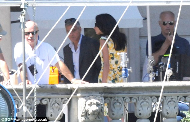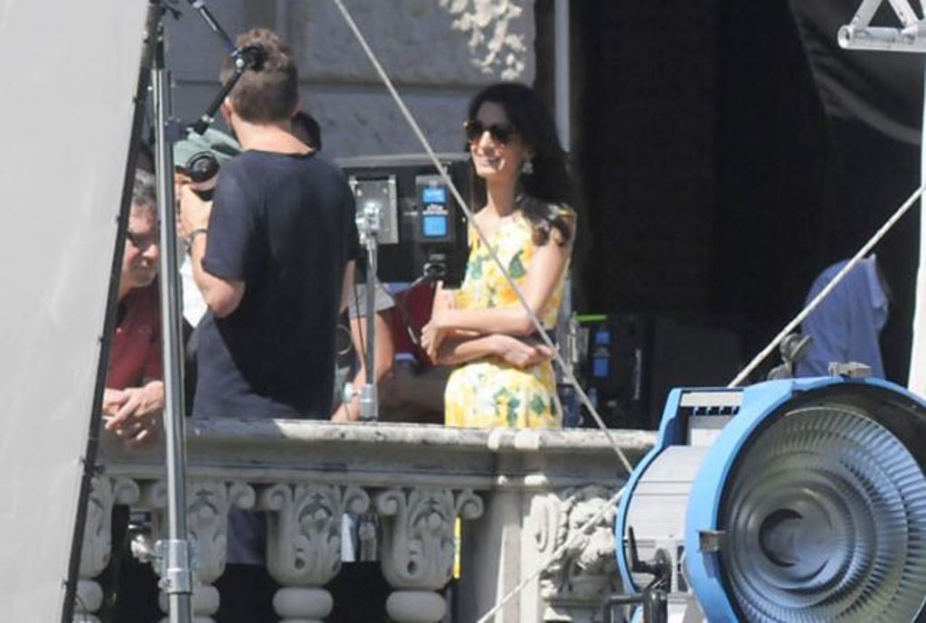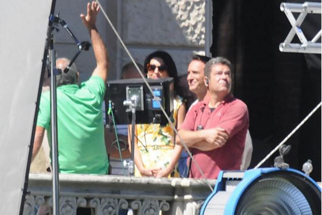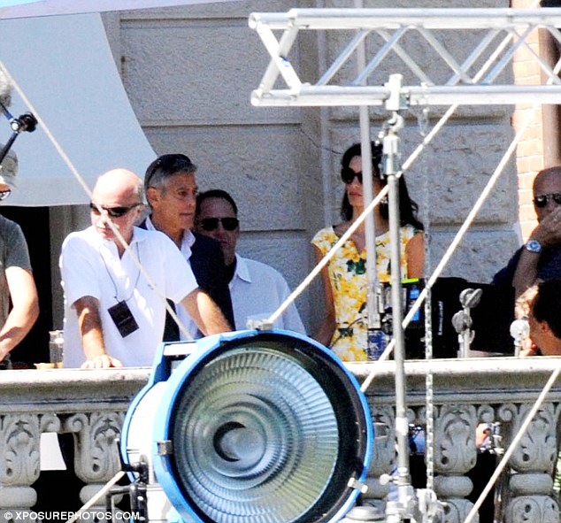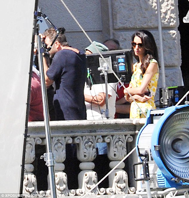 Amal Alamuddin offered George Clooney her support as he got to work on the set of a new advert for coffee brand Nespresso in Cernobboio, Italy on Wednesday.