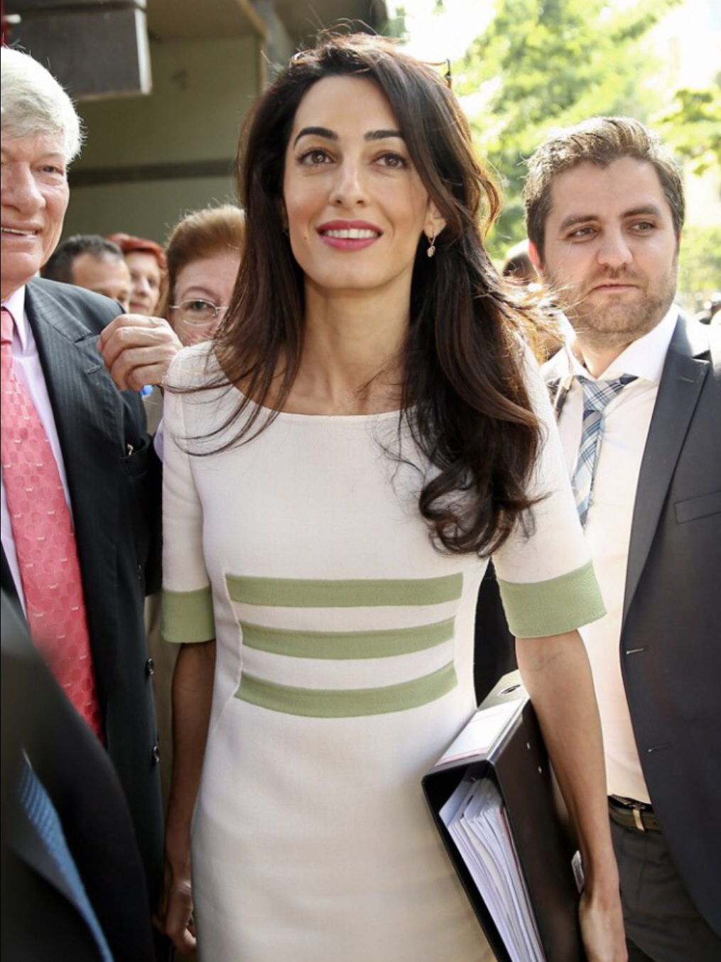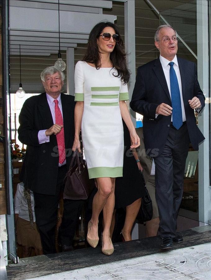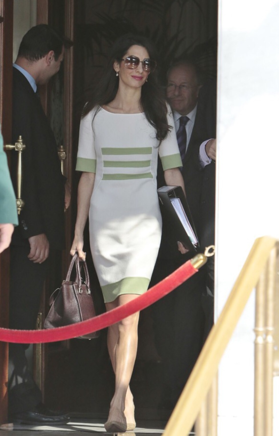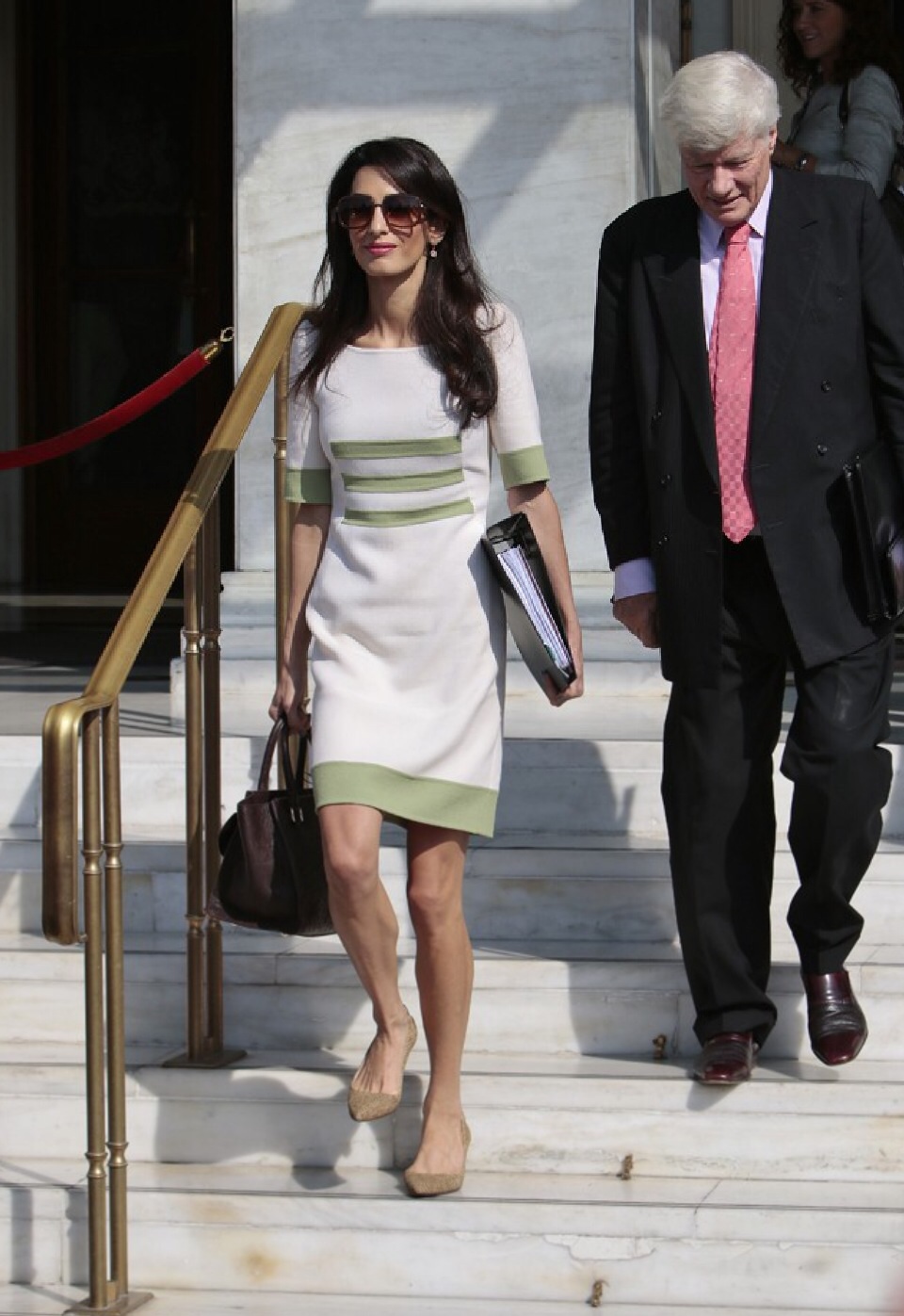 Amal wore a beautiful mint striped dress by Camillo Bona with a taupe Ballin bag and brown sunglasses.