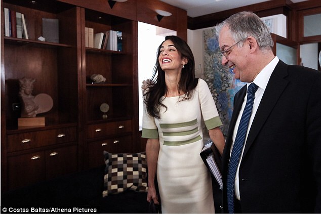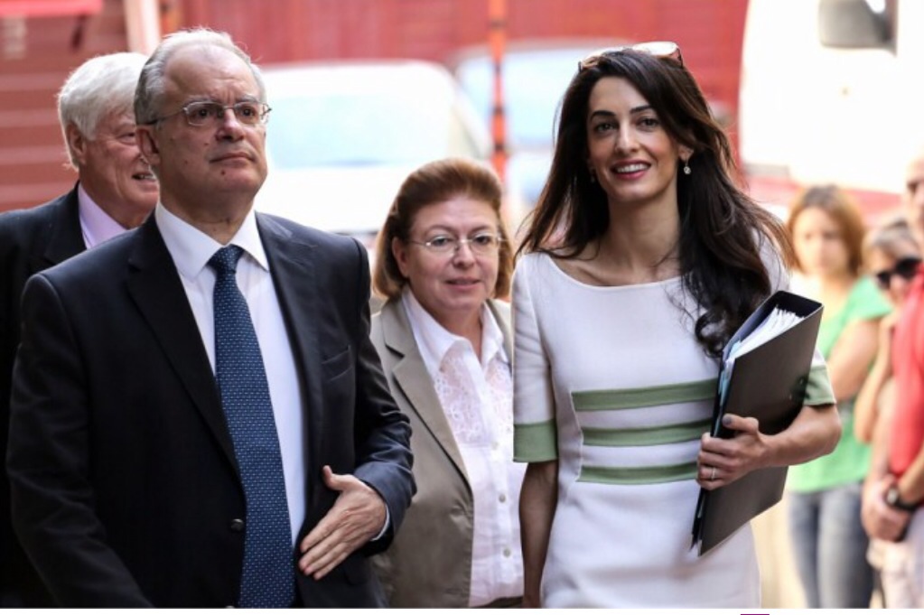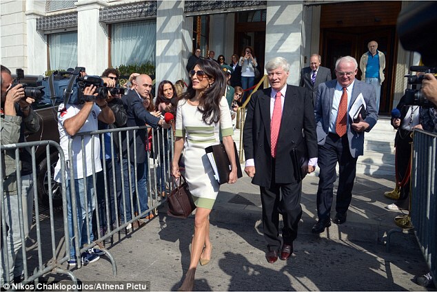 Amal Clooney, Geoffrey Robertson, head of Doughty Street Chambers, and David Hill , head of the International Committee for the Reunification of the Parthenon Marbles arrive at the ministry of Culture and Sports for a meeting with Greek minister Konstantinos Tasoulas.