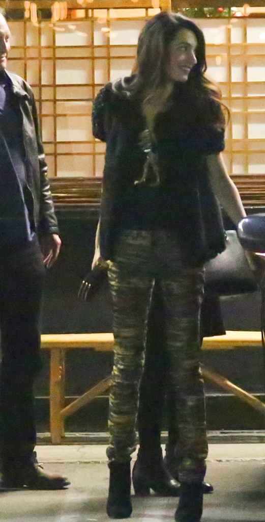 The couple was joined for the dinner by close friends, who sat in the backseat of their car. Amal Clooney wore a fur jacket with embellished short sleeves. camo jeans, geometric clutch, suede boots (the Prada) and a dinausor statement necklace in gold. She looks so stylish and perfect for a dinner with friends.