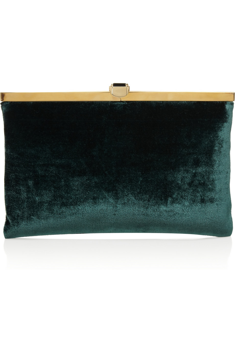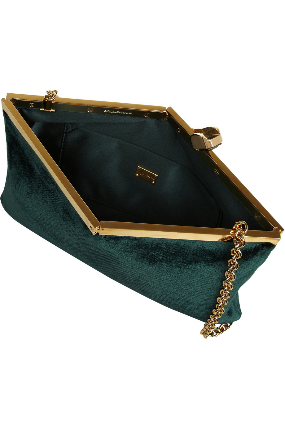 The velvet grey clutch is by Dolce & Gabbana, here in emerald color