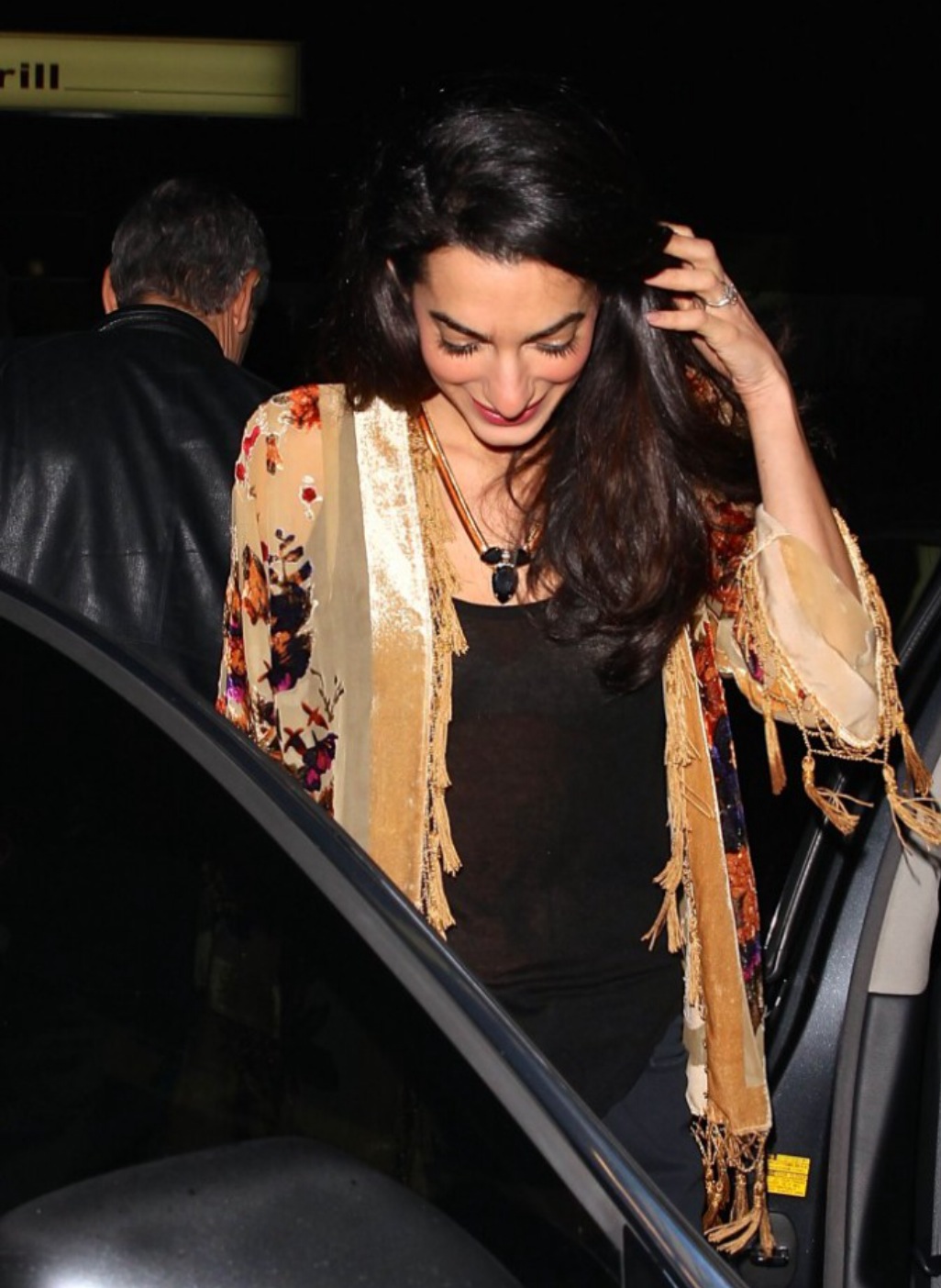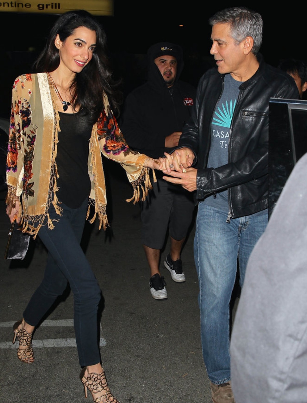 Amal Clooney wore a velvet floral kimono by Shantique Designs with black jeans and top.