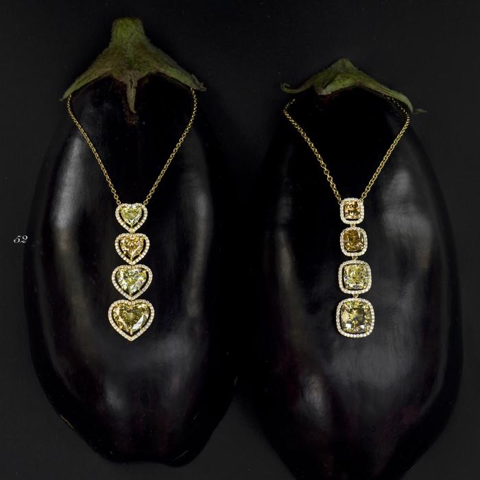 i like how they displayed the necklaces on eggplants. very creative!!