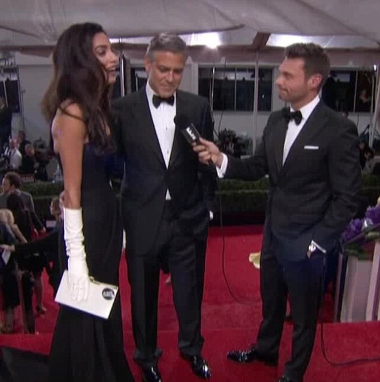 I thought they seemed quite awkward last night. I liked her dress, but she was having to adjust that train on her shoulder a lot, and also touching her hair quite often. Although I like the gloves, I really didn’t like them with that dress. I think a different color would have been better, or some sheer gloves like the ones that Carolyn Besset wore at her wedding so many years back. Amal’s makeup was perfect! I wonder what shoes she was wearing? Also, didn’t you think that t-shirt thing that Ryan Seacrest gave them was a bit odd?