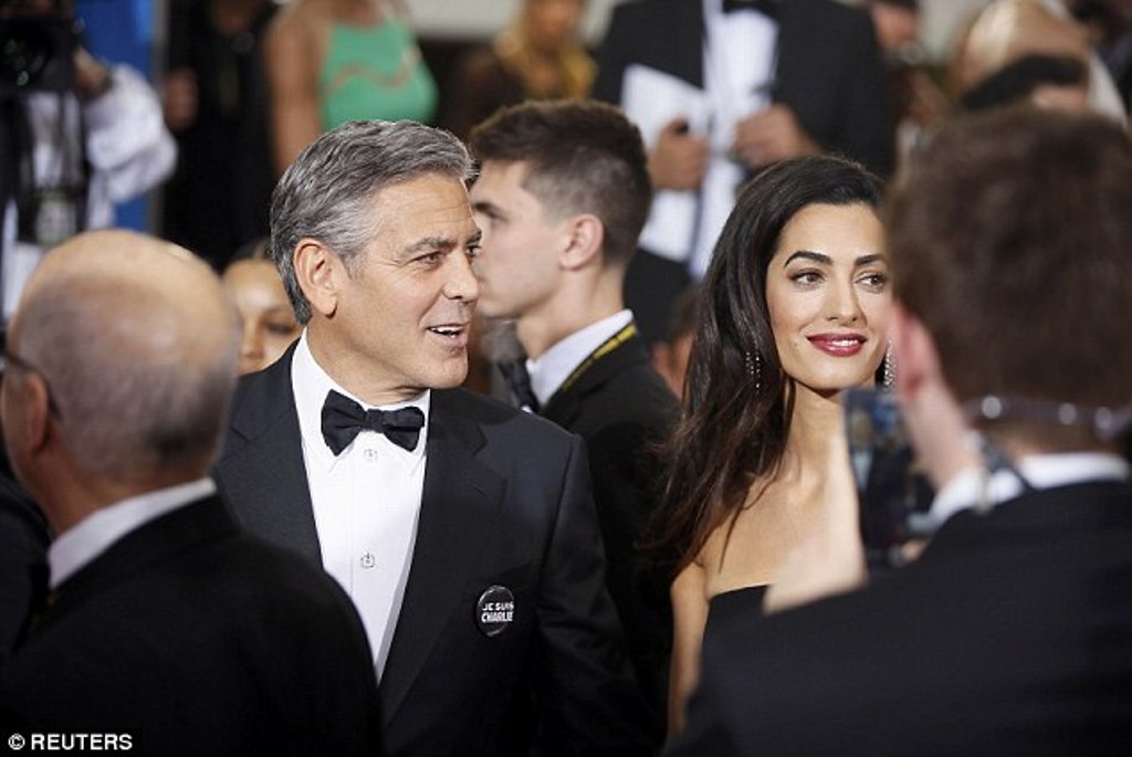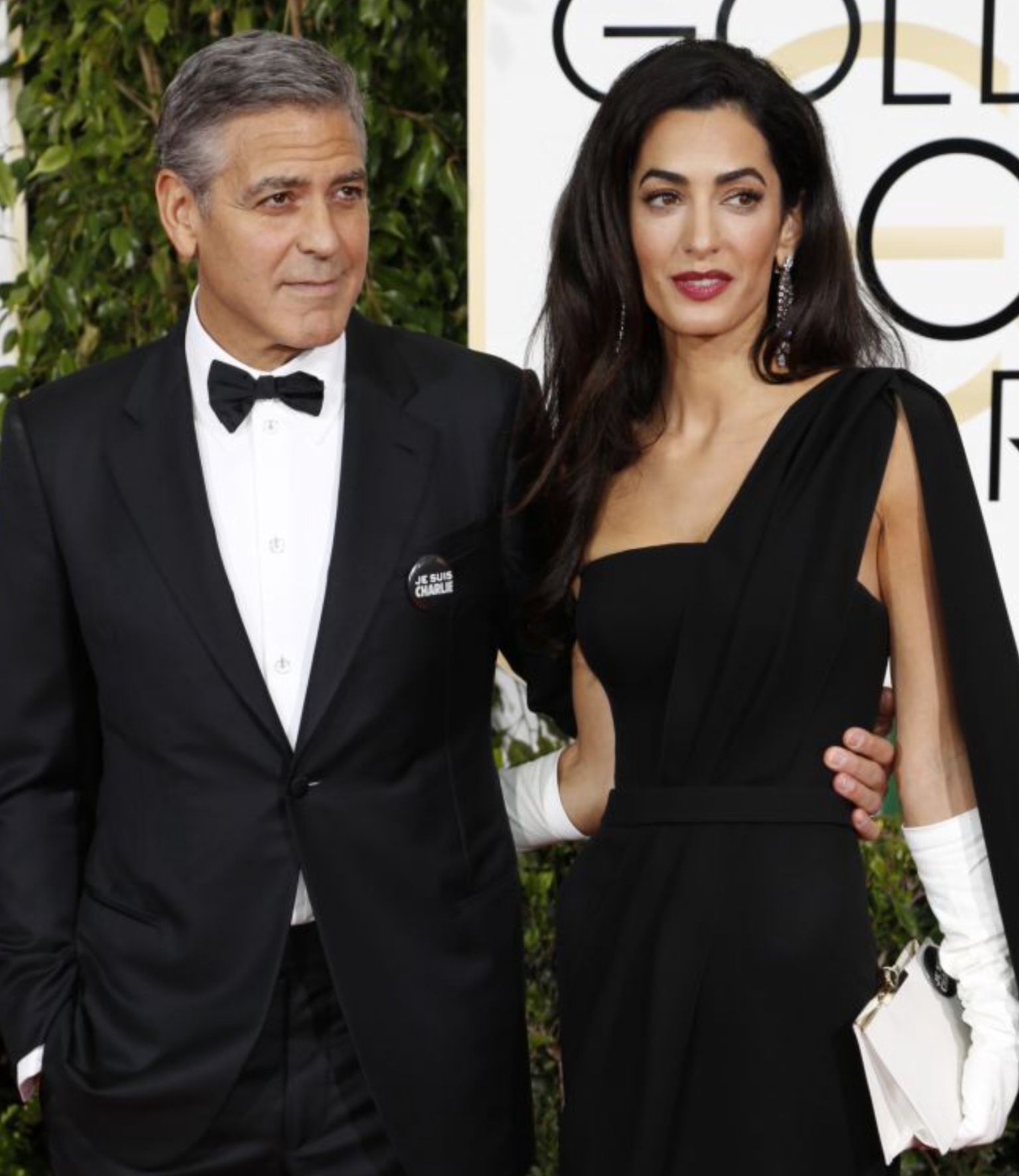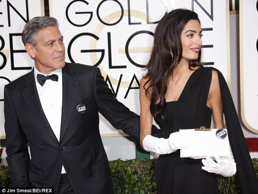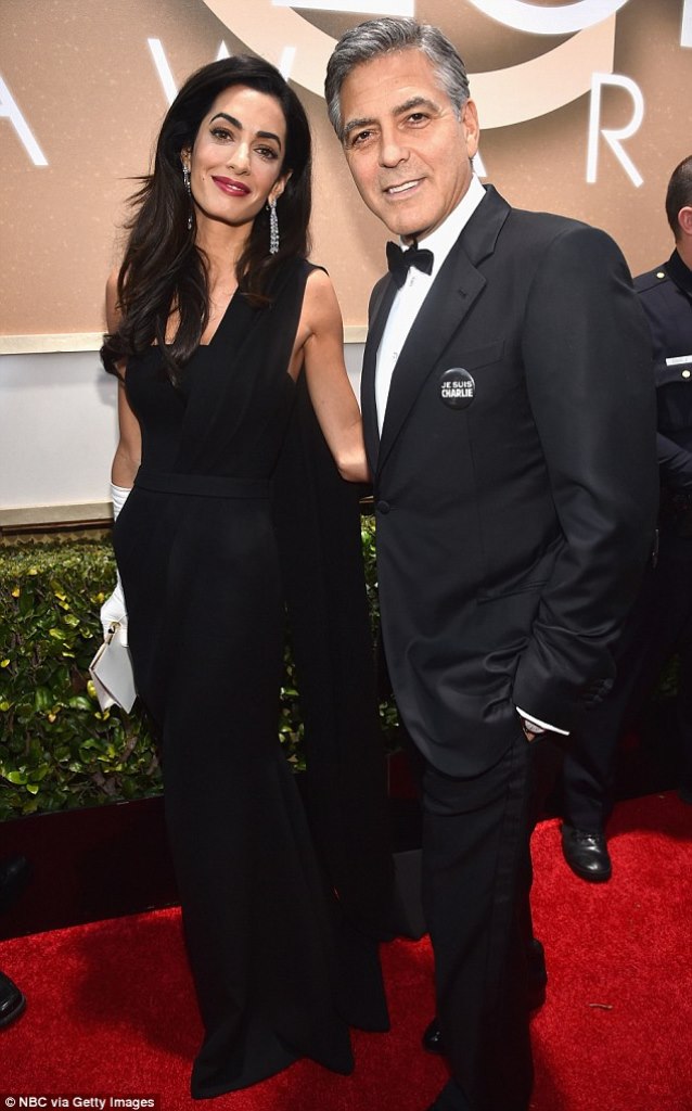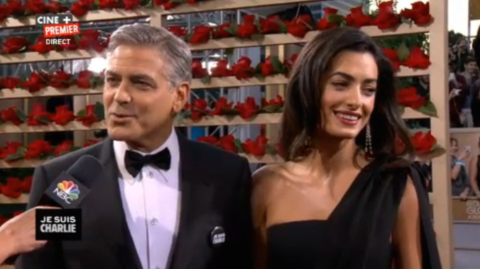 Tonight, Amal and George Clooney arrived in black and white with “JE SUIS CHARLIE” pins, a statement for the tragic events of the week.