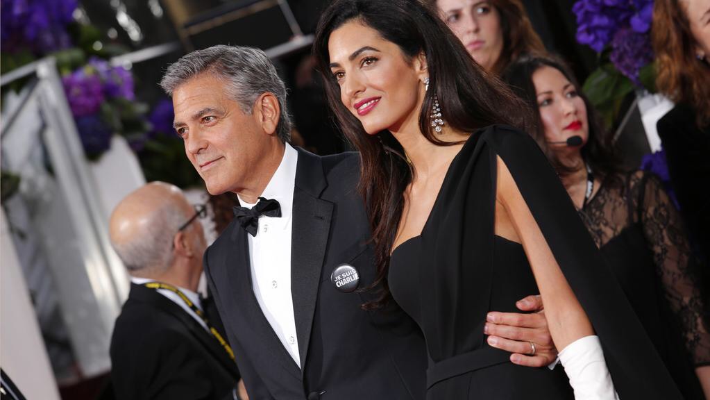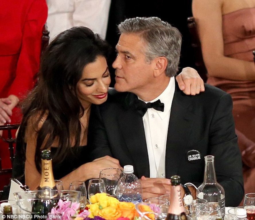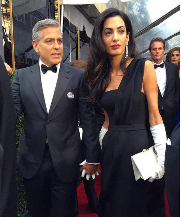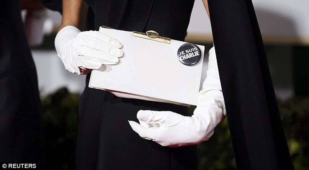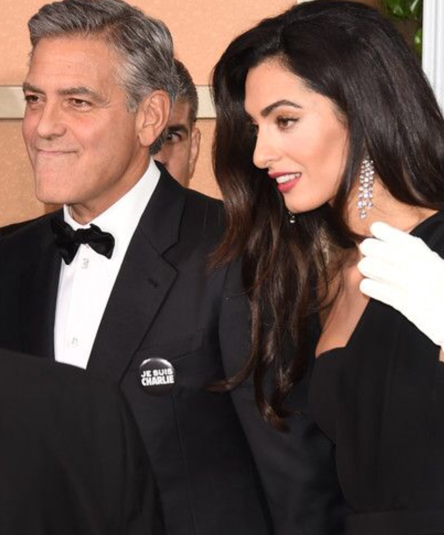 Tonight, Amal and George Clooney arrived in black and white with “JE SUIS CHARLIE” pins, a statement for the tragic events of the week.