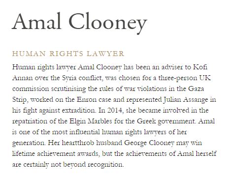 I also wondered if Amal could really be called one of the most influential people. She has become very well known in a short space of time. But what exactly is her influence? She is a relatively junior human rights barrister. Many of her senior colleagues at Doughty Street have had a greater impact in that sphere.