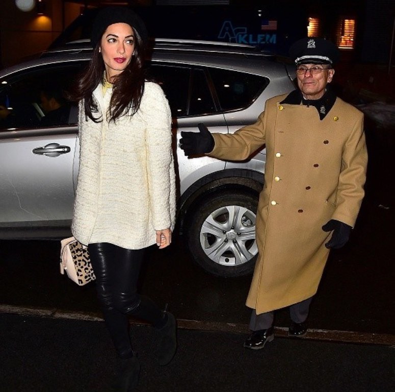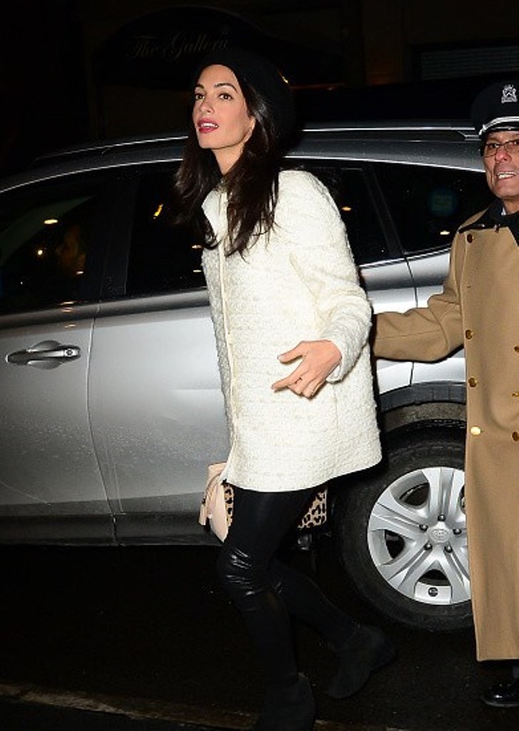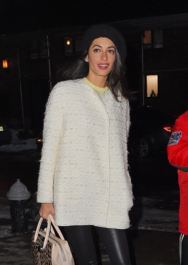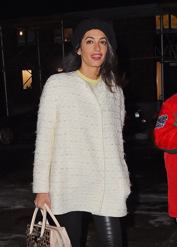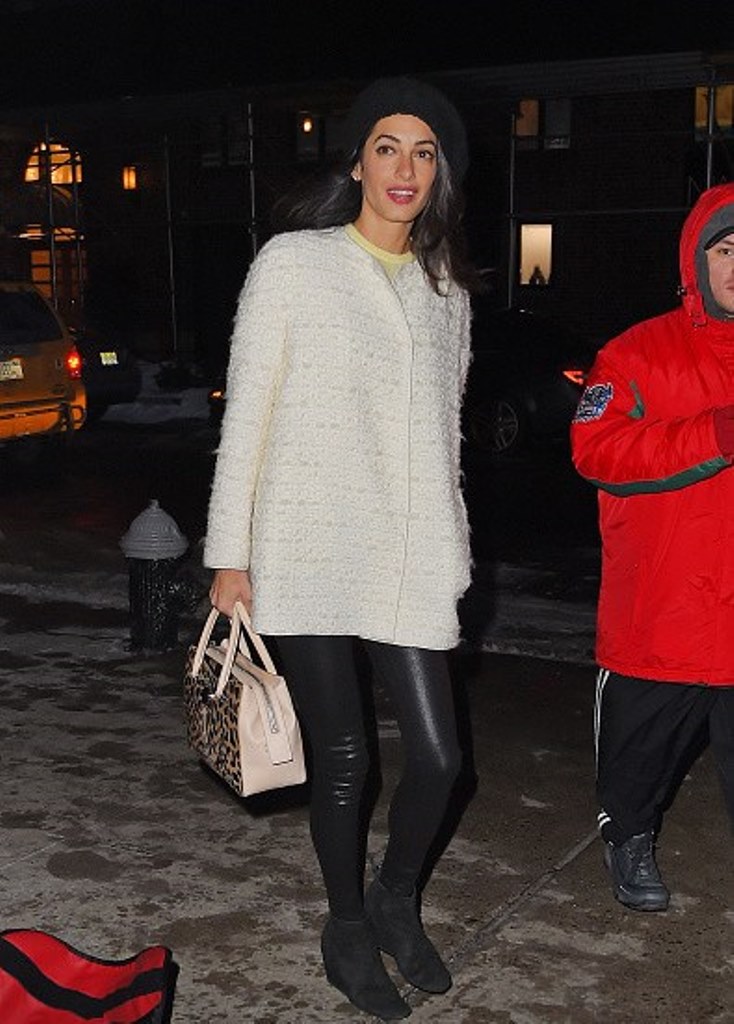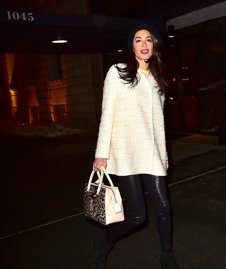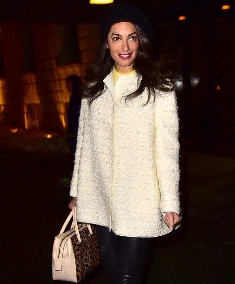 Amal Clooney was spotted leaving the Carlyle Hotel yesterday evening. She looked perfect with fresh colored hair and flawless skin. She wore a blouclé short ivory coat by Gianbattista Valli, with wedge suede black ankle boots, leather trousers and a leo printed bag Gianbattista Valli too.