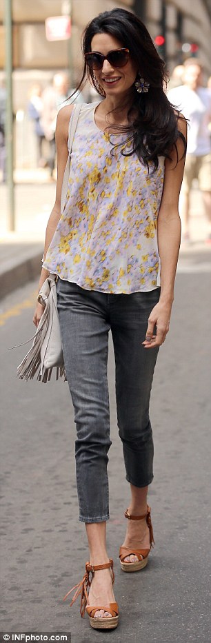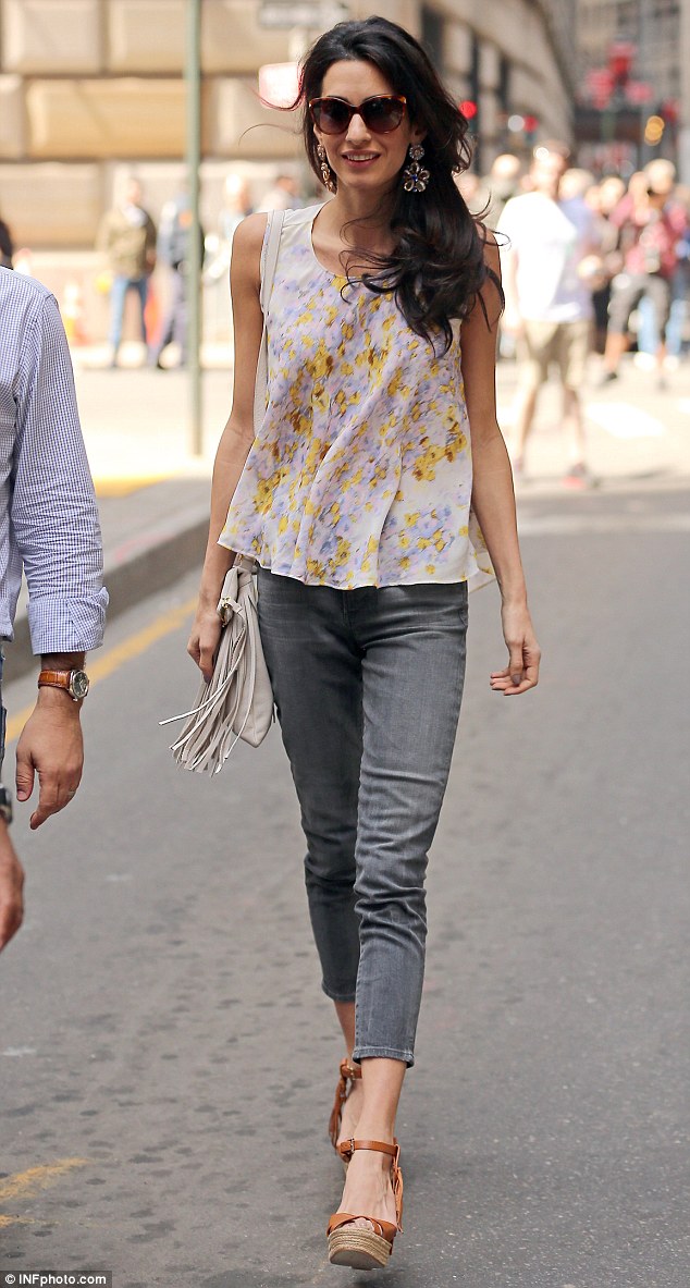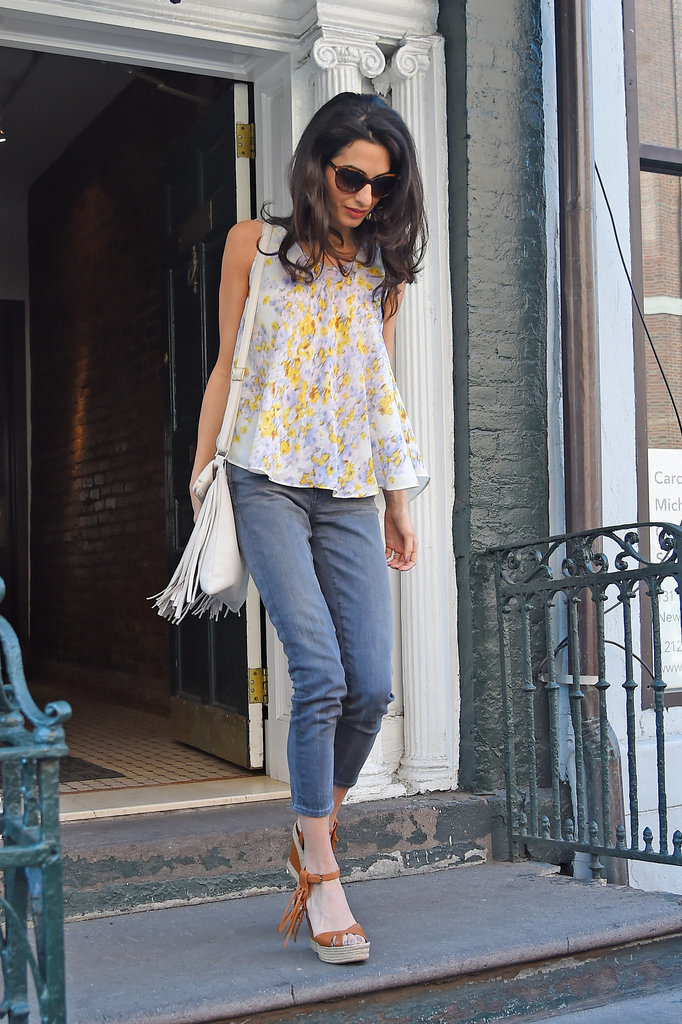 I said this before and I’ll say it again. what I love and find very interesting and refreshing about Amal is the fact that she didn’t adapt an image that is not hers. she didn’t let the pr people carve the expected image of a lawyer out of her. Instead Amal kept her fun, outgoing, and colorful personality and style. do i prefer her in clean cut classic professional outfits? Yes! but that’s not who she is. I think some people, including me, were shocked by her because when we see her, it’s not what we imagine when we think of a lawyer. some even thought she’s a fame thirsty woman. However, Amal is just being herself and staying true to who see is, whether people like it or not. She oozes confidence and spontaneity and doesn’t go around trying to please anyone. She seems like one of those people who expect others to either accept them or get out of their way! Even George seems less controlling and more accepting in her presence. And I agree with you Soos, this outfit is giving me Lebanese vibes. The big statement earnings with a light casual outfit, the light wash (somewhat ill-fitting) capri jeans with chunky wedges, the sunglasses on the head, the thick and voluminous black hair, and most importantly, the confident smile with such a laid-back outfit is totally a Lebanese thing!