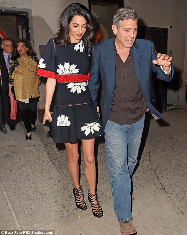 Amal looks beautiful here, but if I was wearing such a short dress/skirt out for dinner*, I would have paired it with opaque black tights, similar to the tights that Amal wore when she was spotted in that Dolce & Gabbana dress at Heathrow last November.