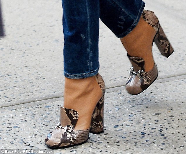 I find the ripped jeans ridiculous … and the snake skin is a NO-NO!!!! Apart from that she looks good as ever, not disappointed!
