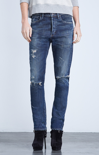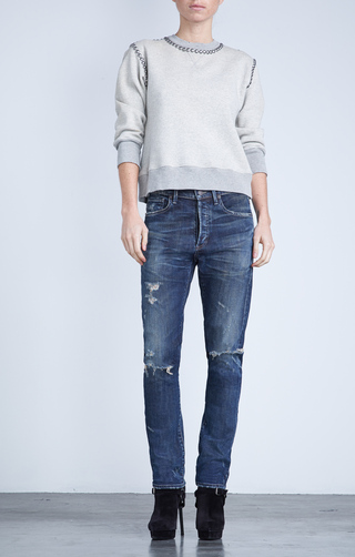 I think the sweater with jacket and boots are so structured that it doesn’t look right with the ripped jeans. A great pair of dark bootcut or even slightly flared ankle jeans without holes would have suited the top half really well.