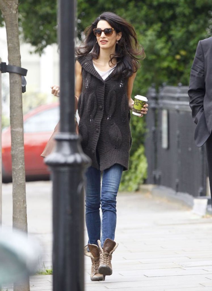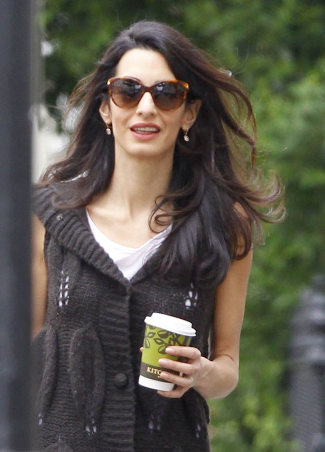 Amal Clooney was spotted in London yesterday in a casual outfit and with a coffee cup in the hand 🙂 She is back in London to support husband George Clooney in his London premiere of “Tomorrowland” on Sunday and to follow her cases at Doughty Street Chambers office.