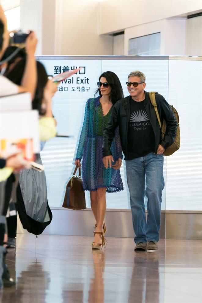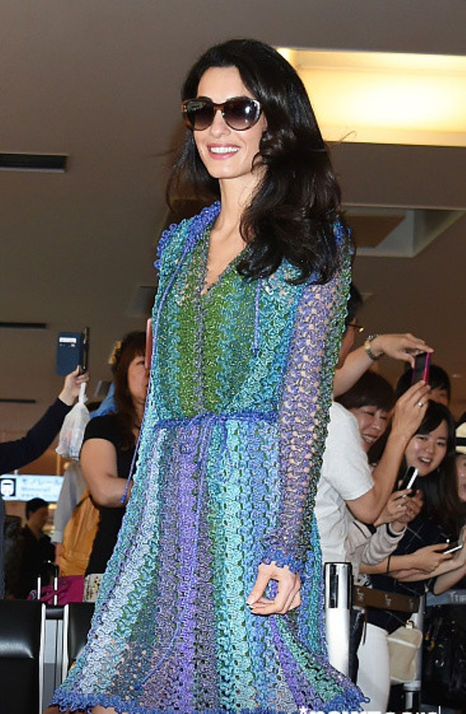 Amal and George Clooney arrive at Haneda airport in Tokyo. Amal Clooney wore a crochet dress by Missoni.