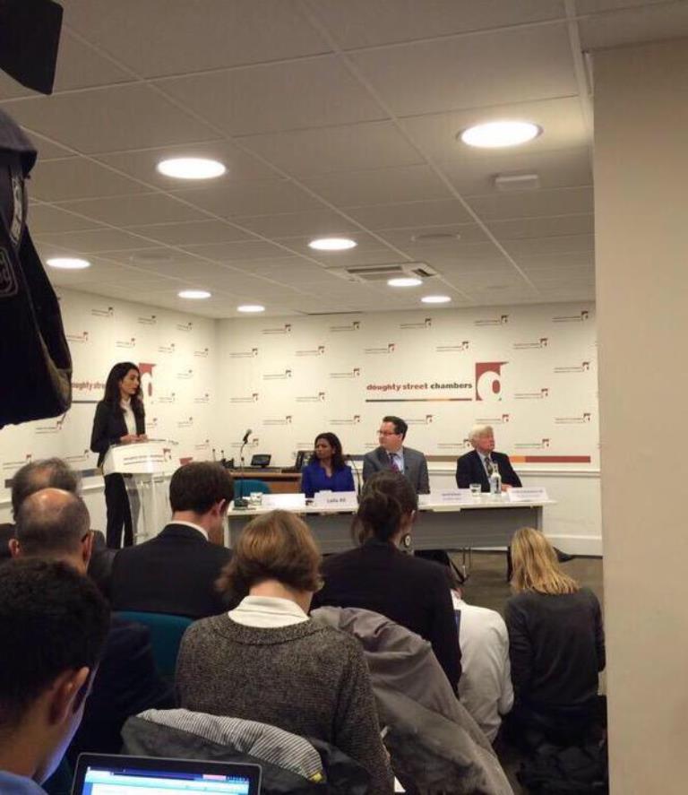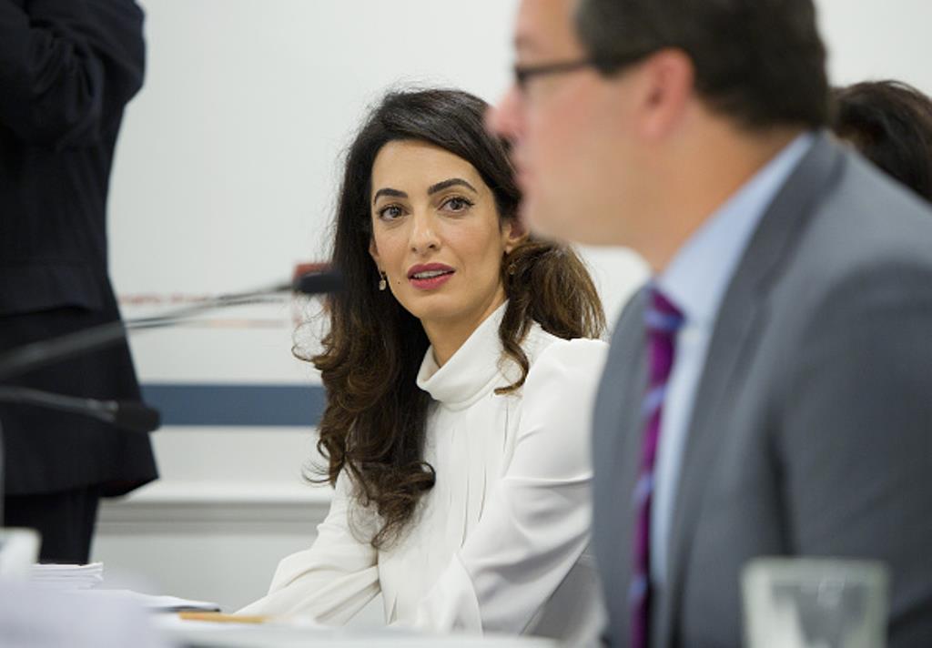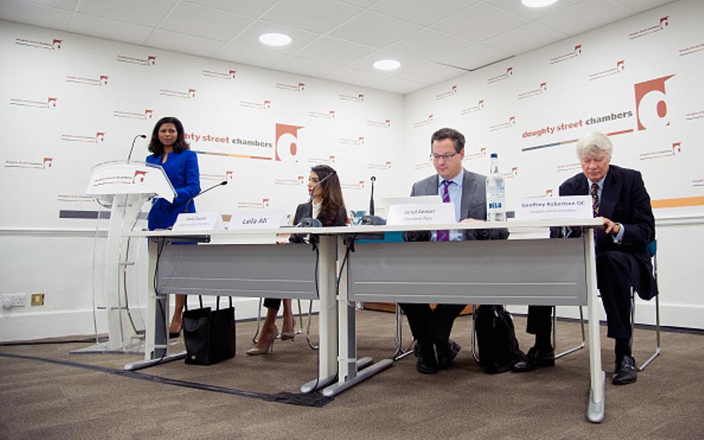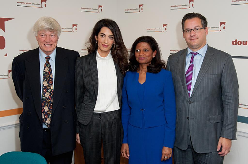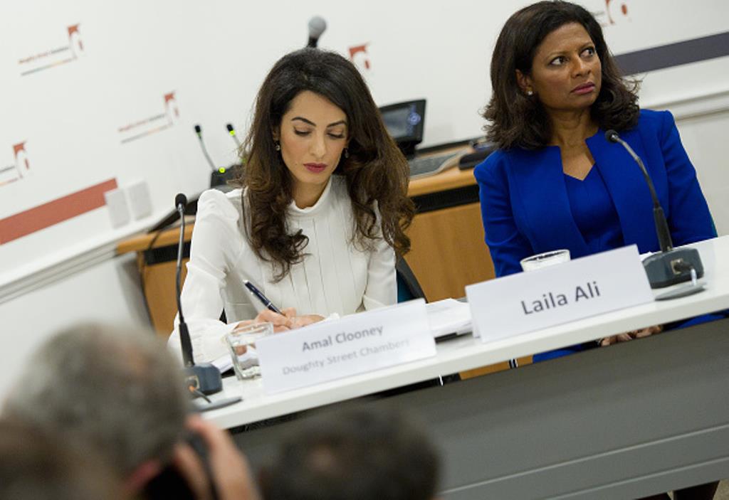 LONDON, ENGLAND – OCTOBER 05: (L-R) Geoffrey Robertson QC, Amal Clooney, Laila Ali and Jared Genser attend a press conference regarding the detention of Mohamed Nasheed, President of the Maldives at Doughty Street Chambers on October 5, 2015 in London, England. Amal Clooney is part of an international legal team seeking to release Maldivian President Mohamed Nasheed after he was was jailed for 13 years. The UN have found Nasheed’s detention in violation of international Law. (Photos by Eamonn M. McCormack/Getty Images)