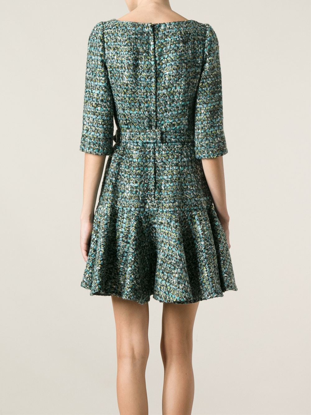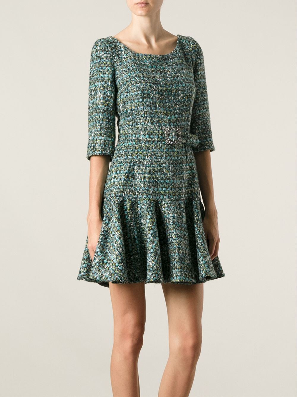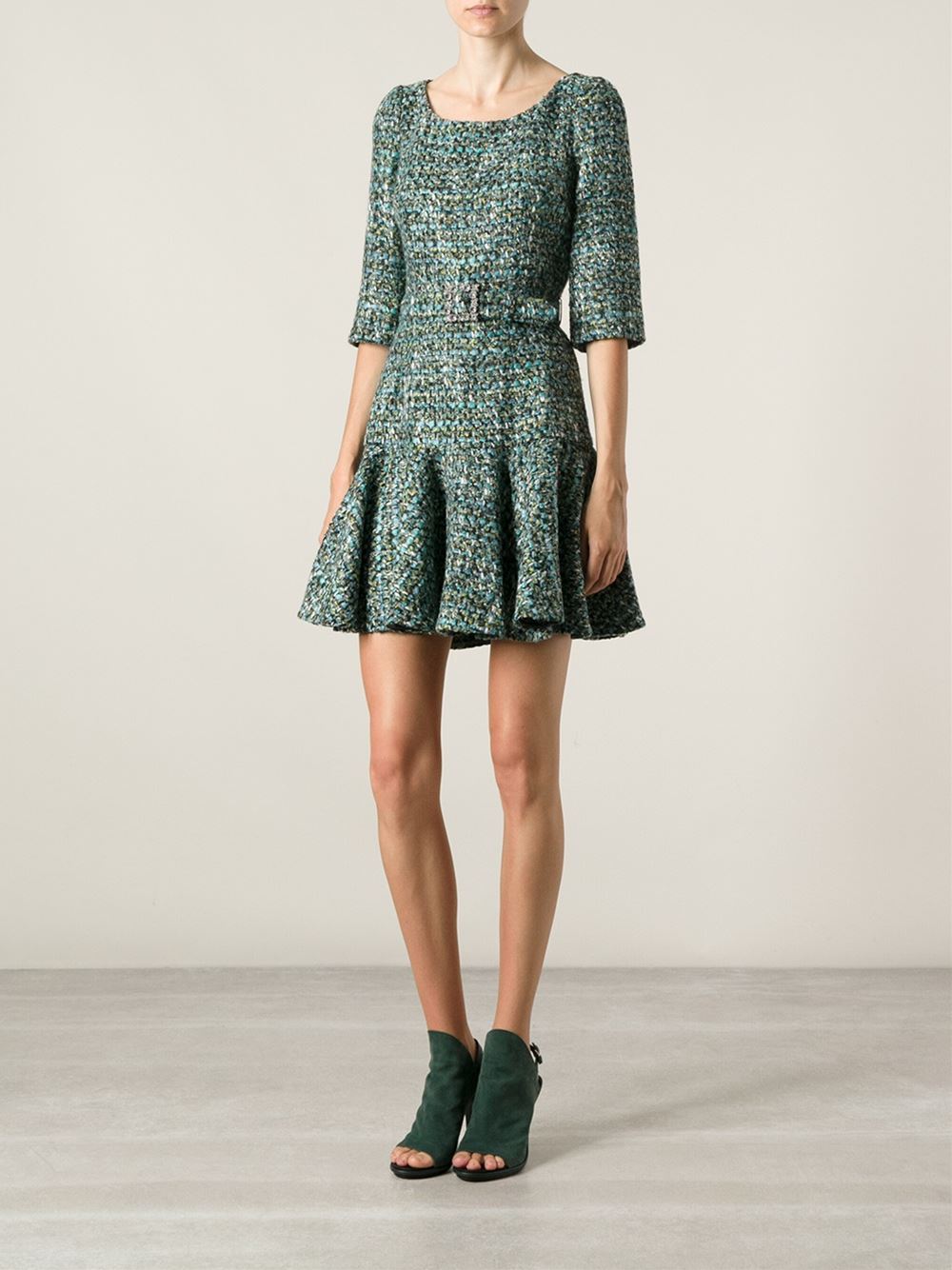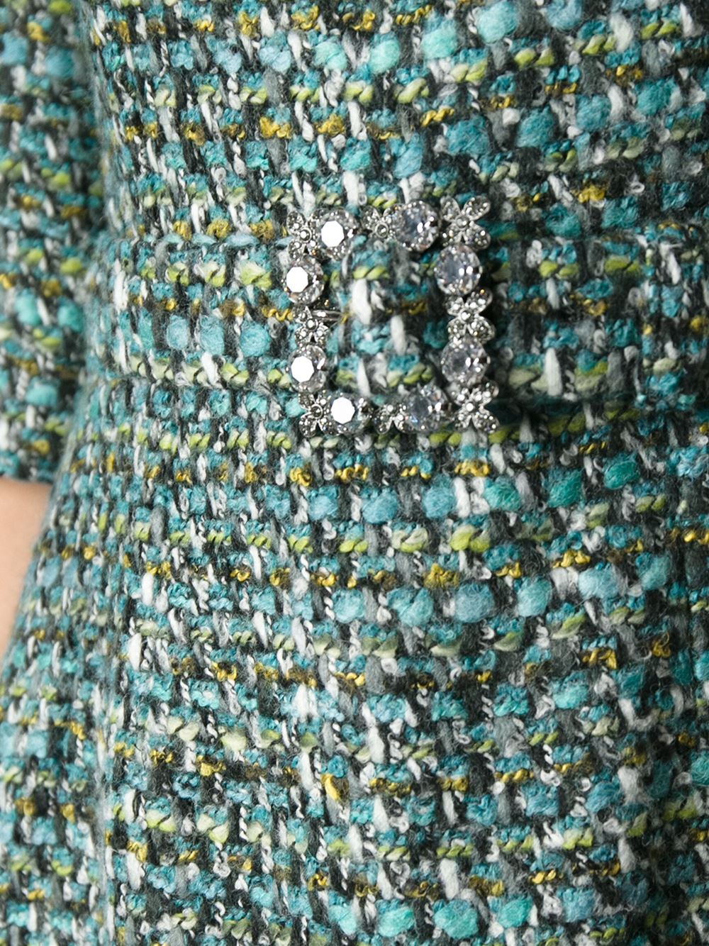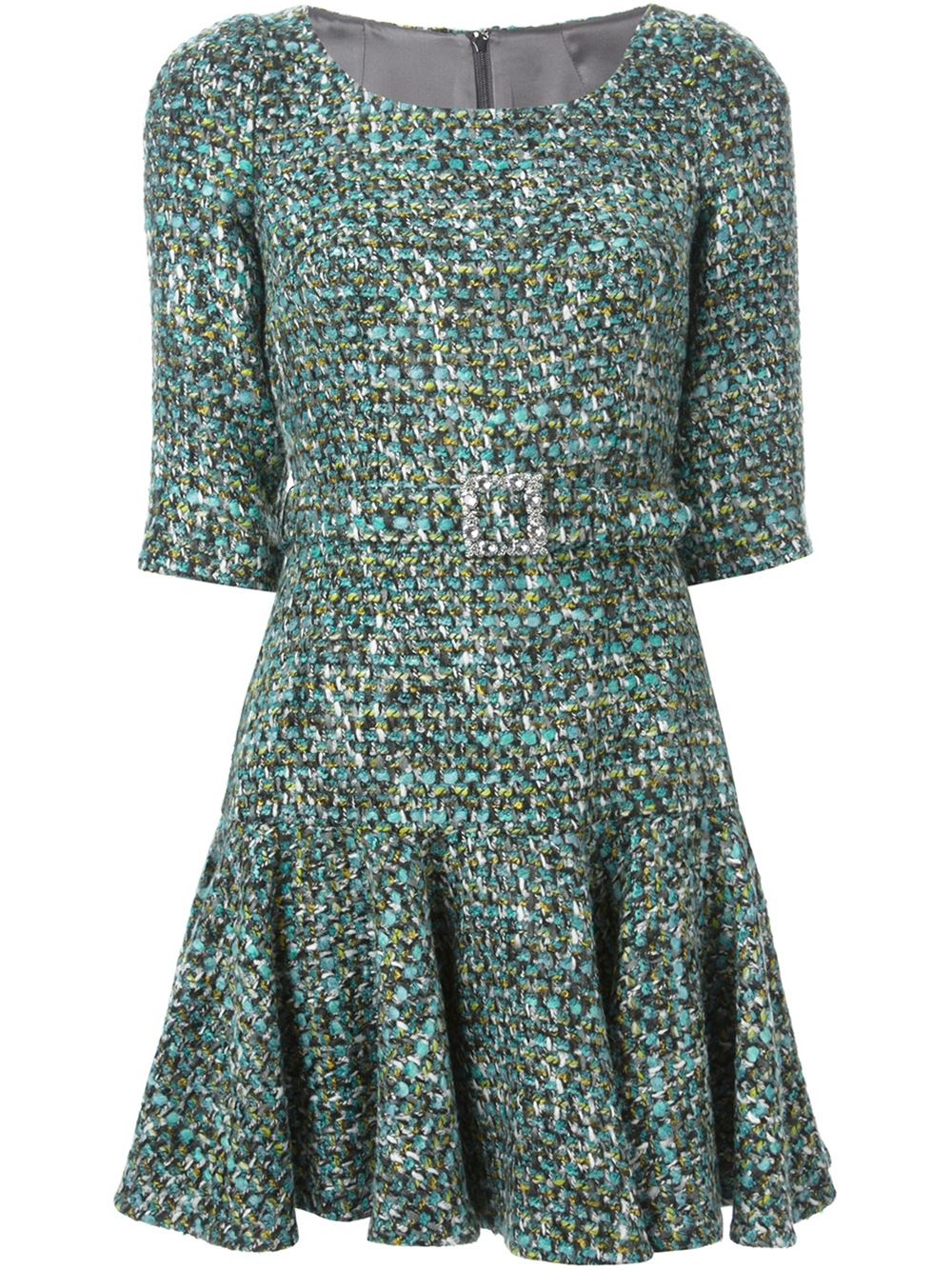 This tweed-y number is a master piece. The mix of colors are fabulous! Shades of teal with yellow threads. I really like this one. If you are looking for “Runway”, this one is definitely it! The shoes on the model with the open toe in dark teal look great! I like it together with the dress. 🙂 The rhinestone dress belt is super cute! Who needs jewelry with this overall look? Win! 🙂