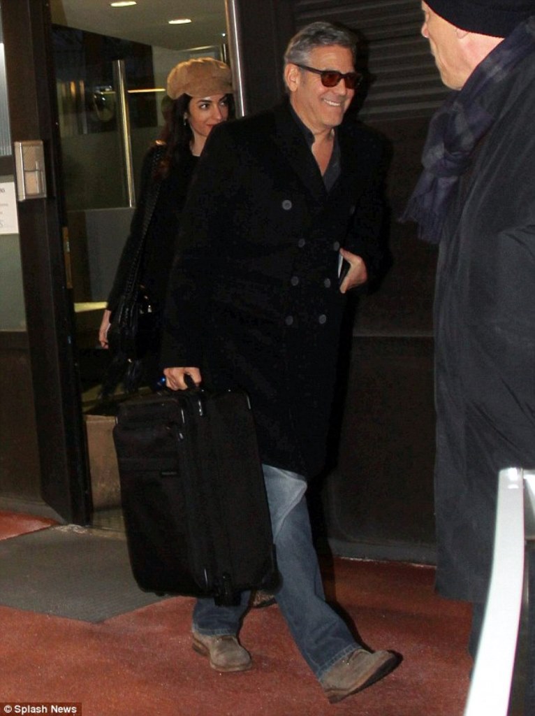 Amal and George Clooney are all smiles while carrying their luggages out of the airport after an international flight on Wednesday  in Berlin, Germany.