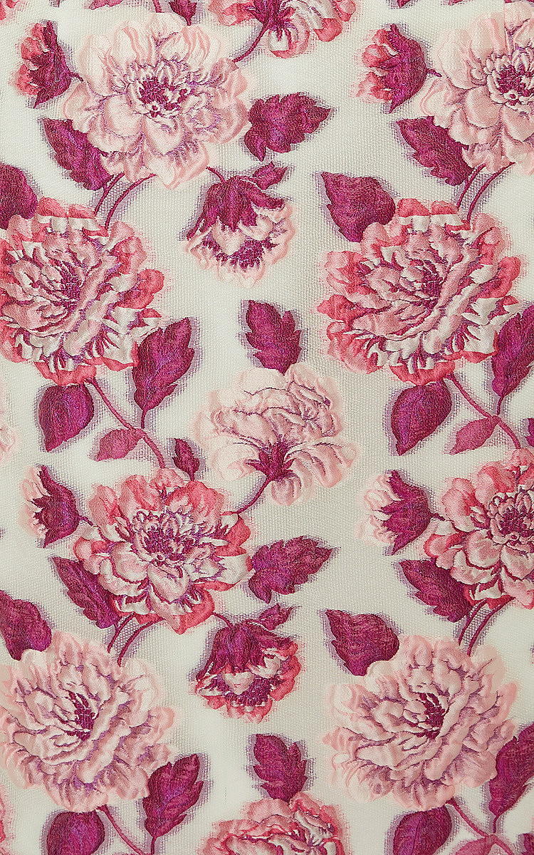 Floral appliques in a full palette of pinks embolden a sleek sheath in Giambattista Valli’s floral-cloque dress. The european purveyor of the ultimate feminine fashion continues these pursuits with this prismatic frock classic in silhouette and striking in effect.