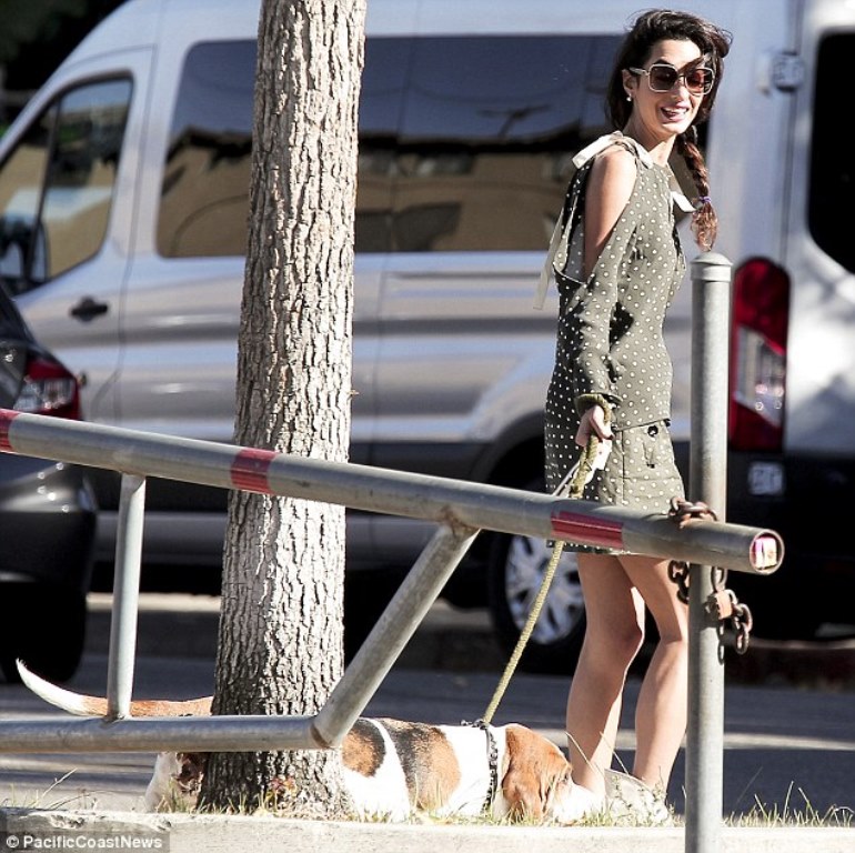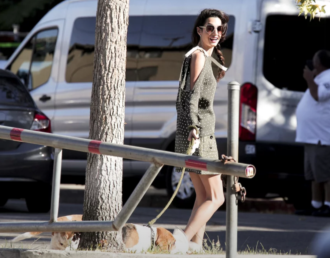 The dress is funny, the leash is hideous, the dog is sweet, Amal is beautiful.