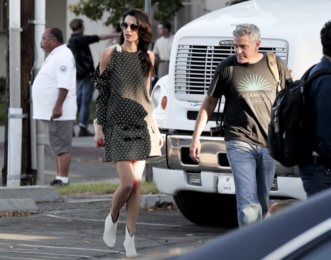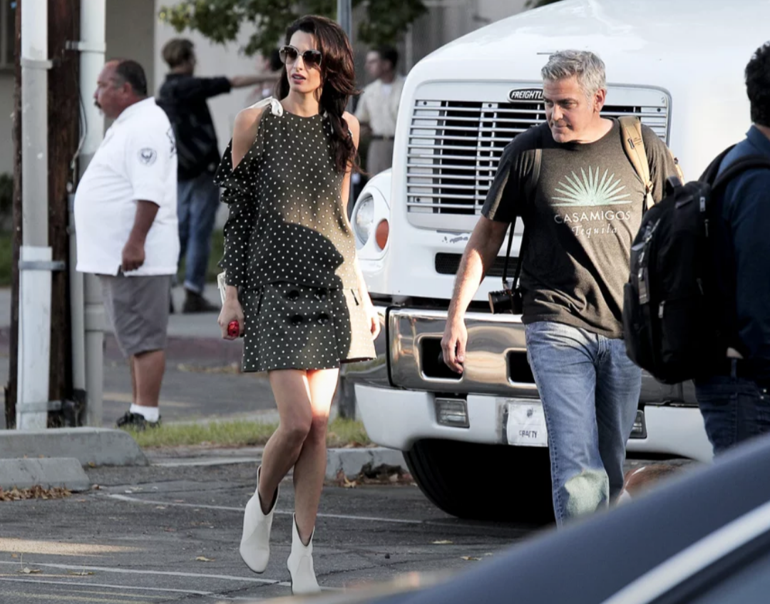 Amal and George Clooney looked extremely happy together on Tuesday while on the set of the actor’s latest project in Los Angeles.