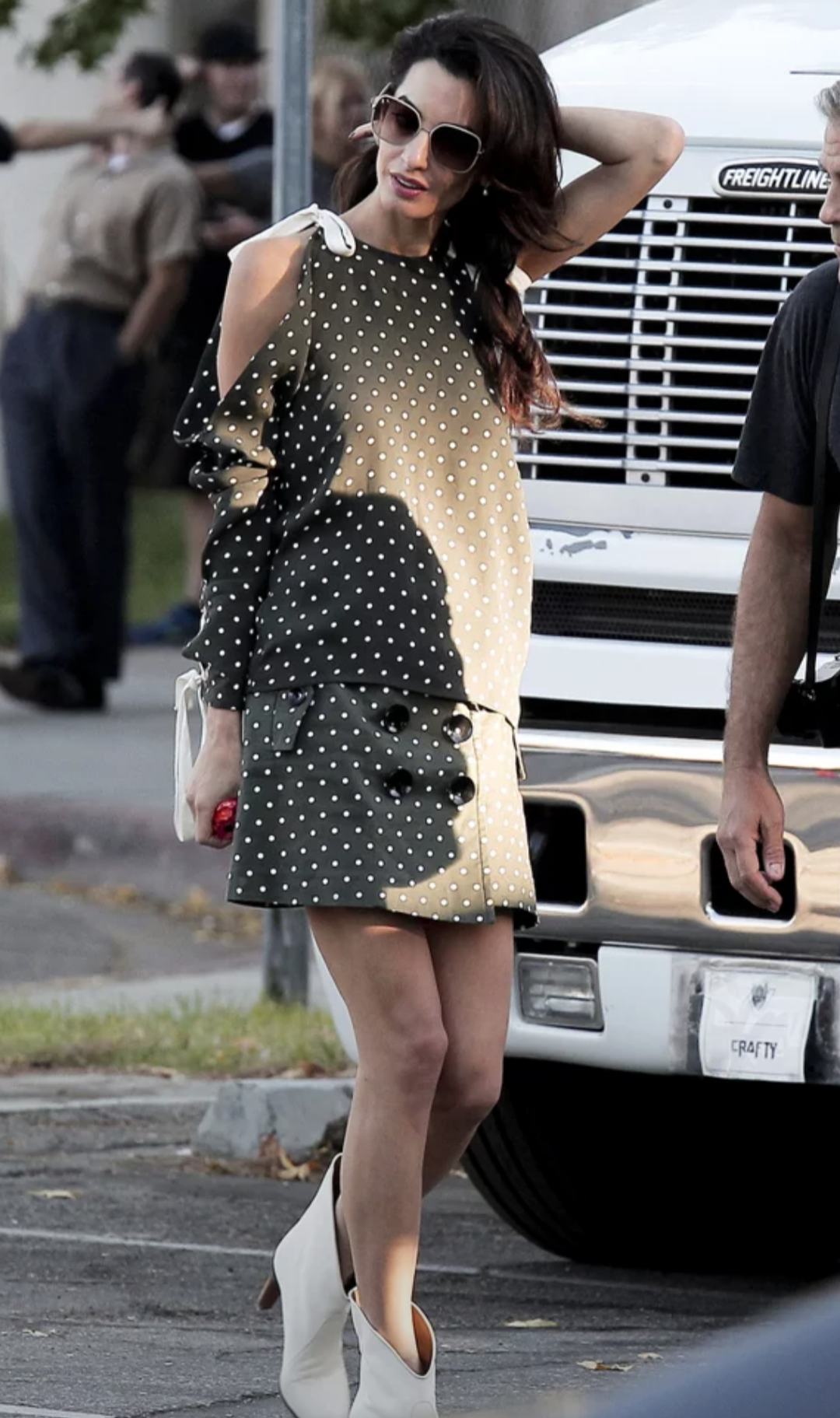 I suspect she’s on her way to, or coming from, a more formal affair, and stopped by to see George. If not, she’s way overdressed just to visit a movie set, and walk the dog.