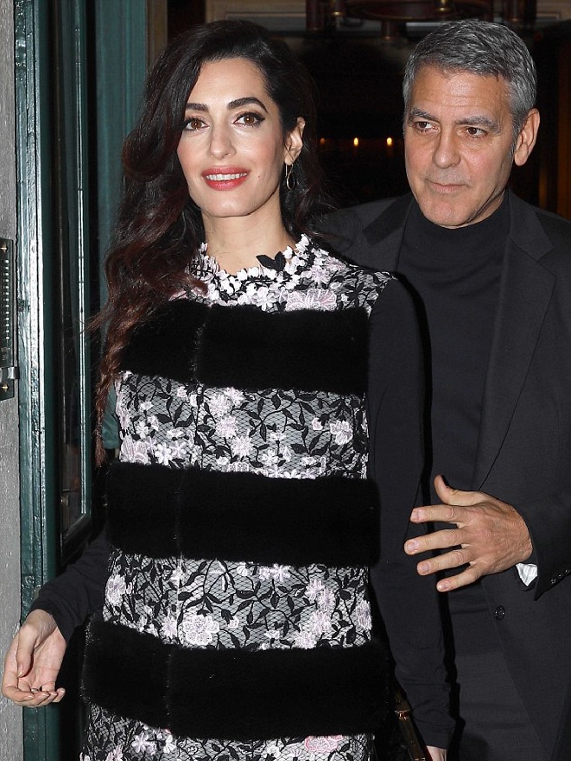 Amal looks lovely but I don’t like her choice of clothing. It is fur, for one, but it also looks like prison bars across her chest.