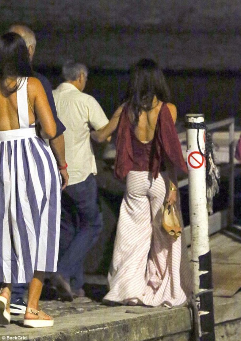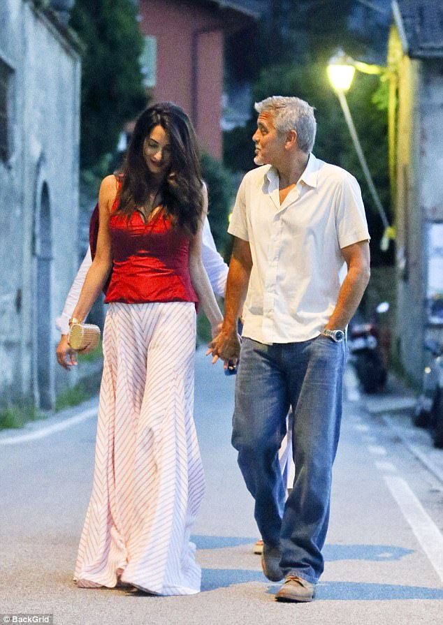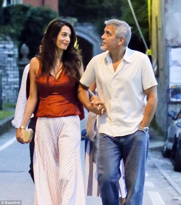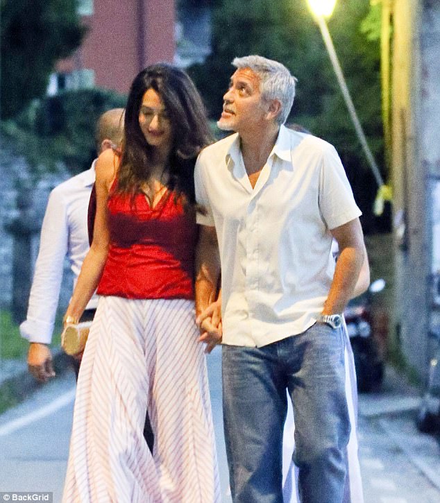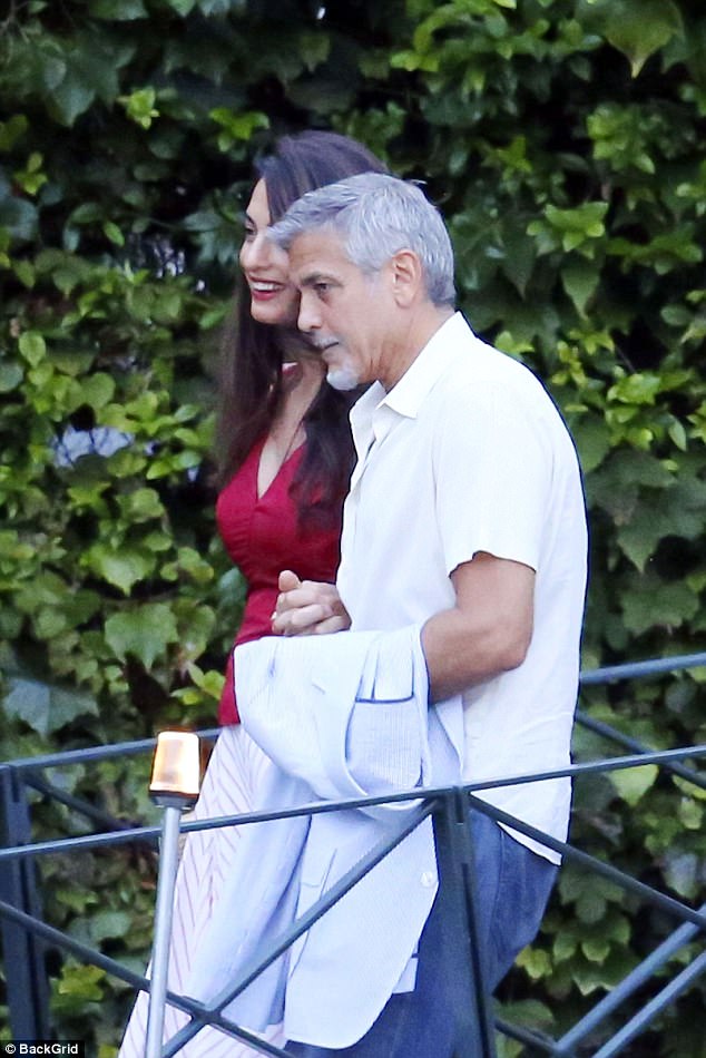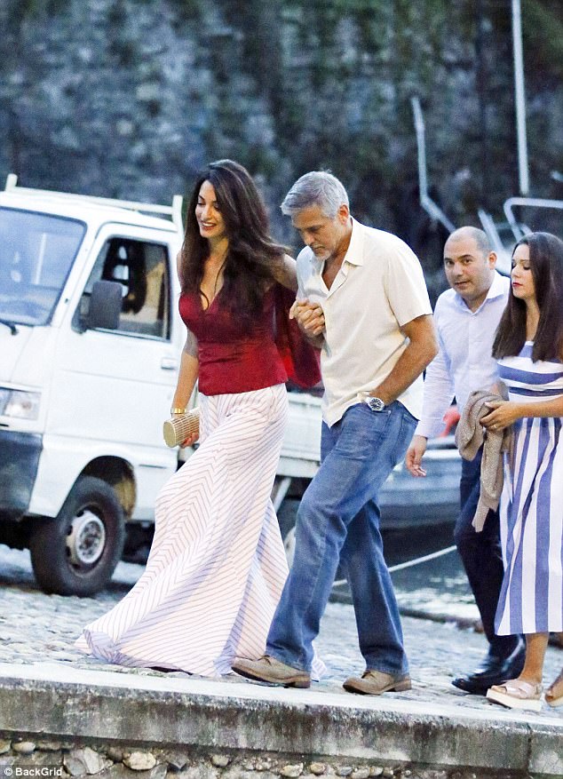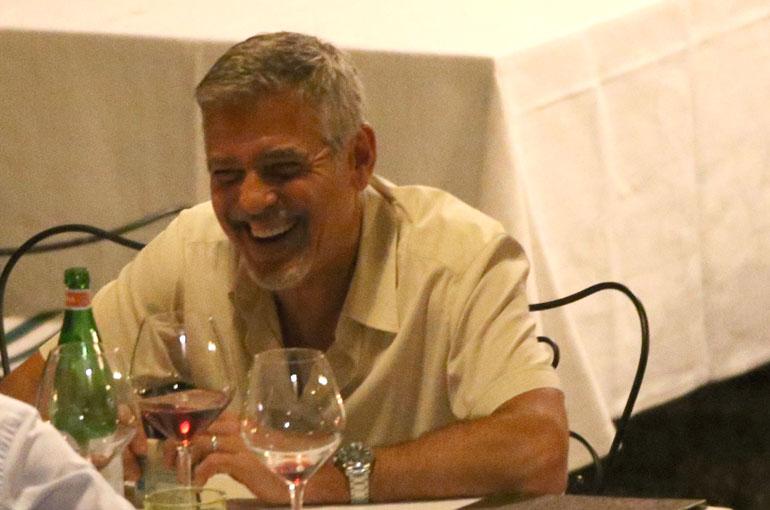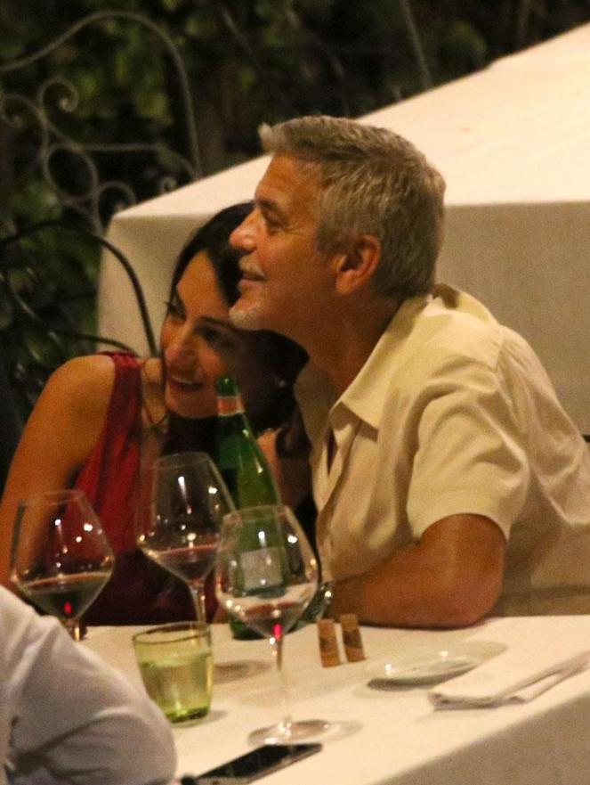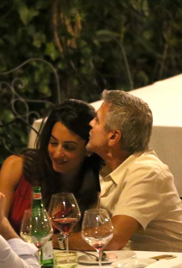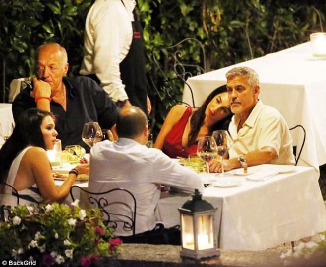 Amal and George Clooney have been spotted week dining with friends and security guard at one of their favourite restaurants Le Darsene restaurant in Bellagio, Italy.