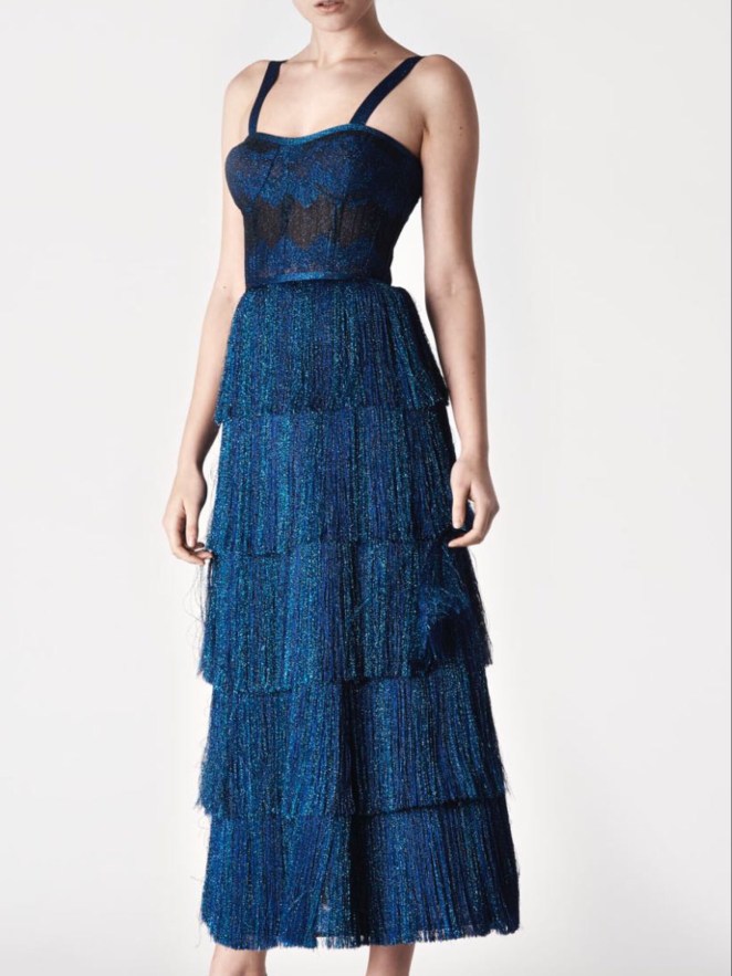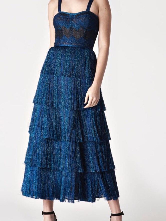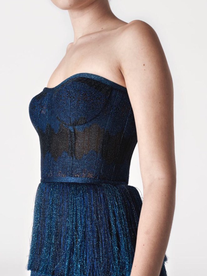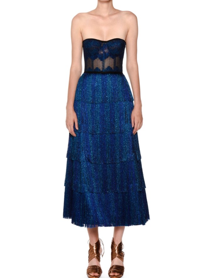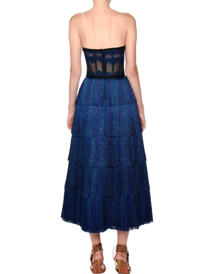 This Missoni gown features a sweetheart strapless neckline, corset bodice construction, and a fringe detailed skirt.