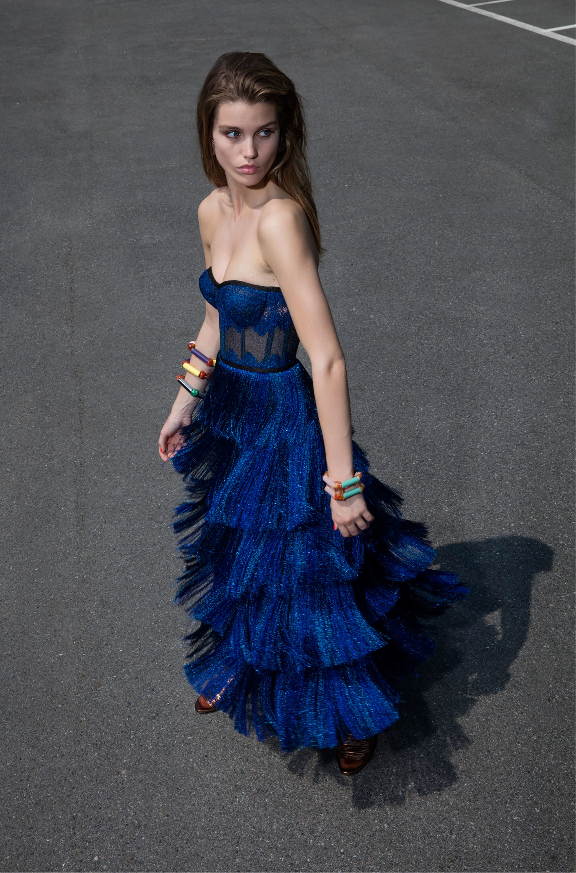 This Missoni gown features a sweetheart strapless neckline, corset bodice construction, and a fringe detailed skirt.