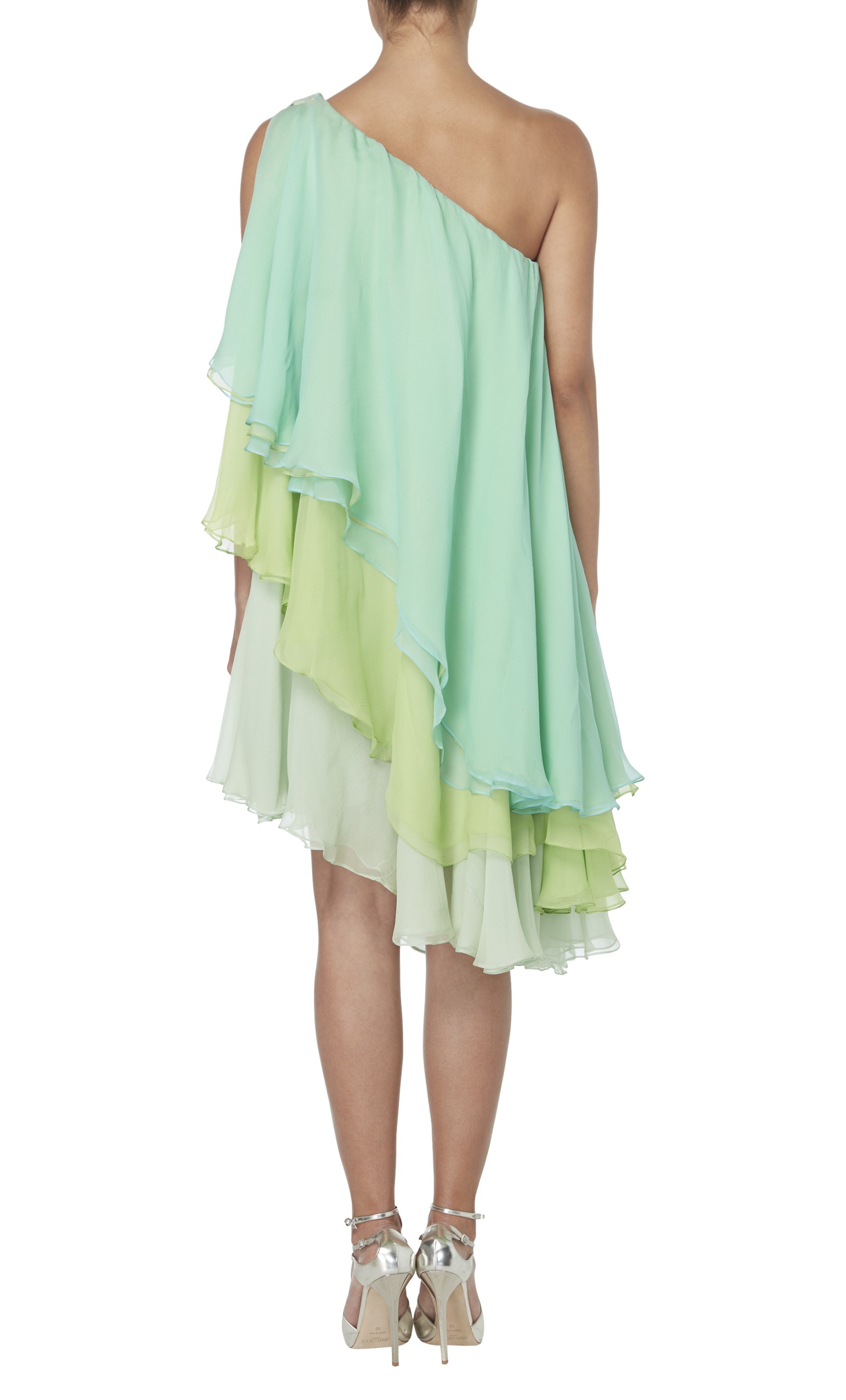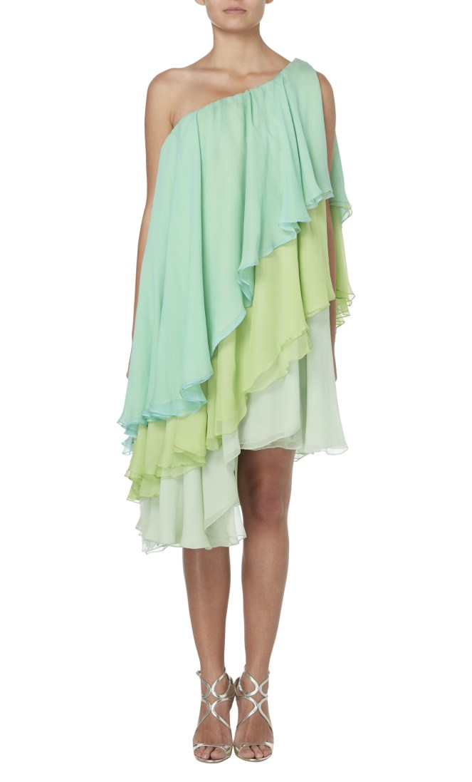 Amal is very pretty in this dress. I prefer the short version which is lighter and less busy or frilly. I love those three shades or nuances green altogether and find the look itself young and modern.