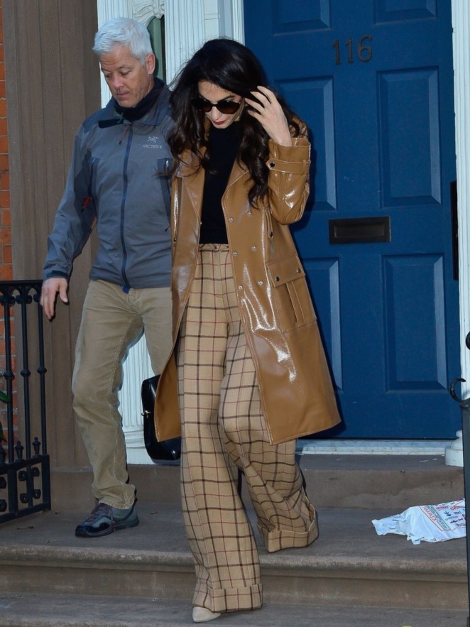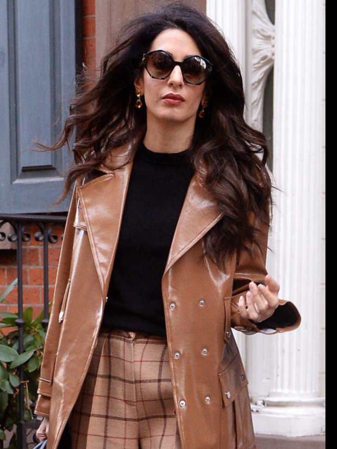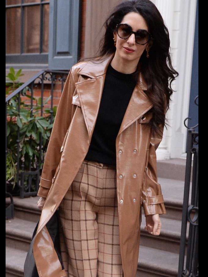 Amal Clooney looked stylish in a brown jacket, black shirt and tan plaid pants leaving her appartment at 116 Sullivan Street in SoHo, Manhattan, New York.