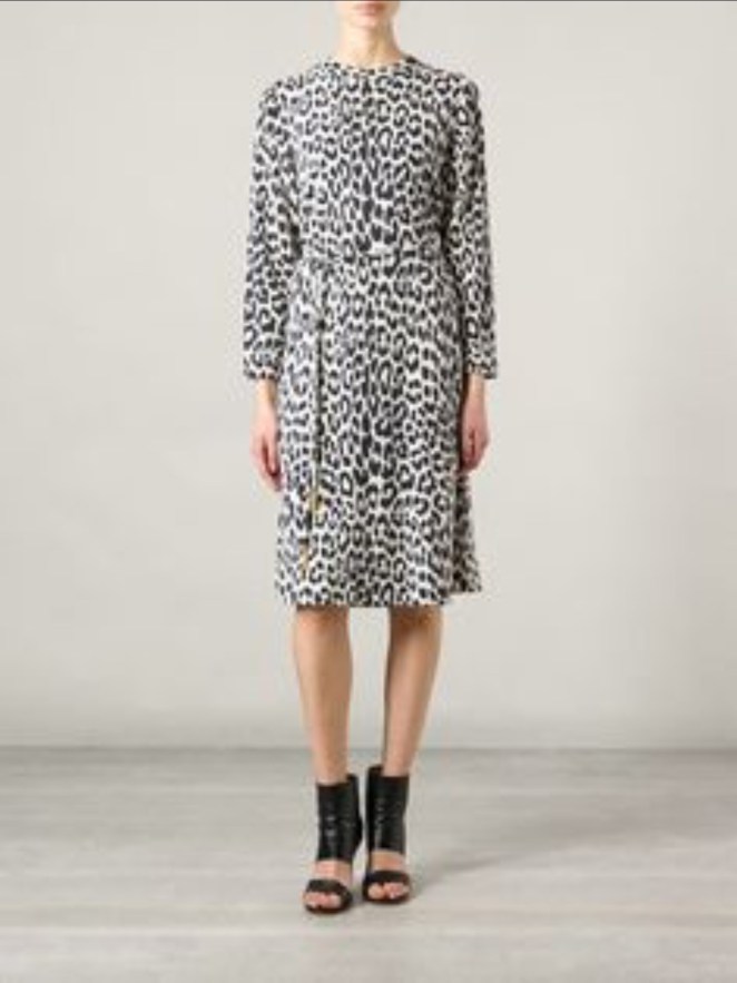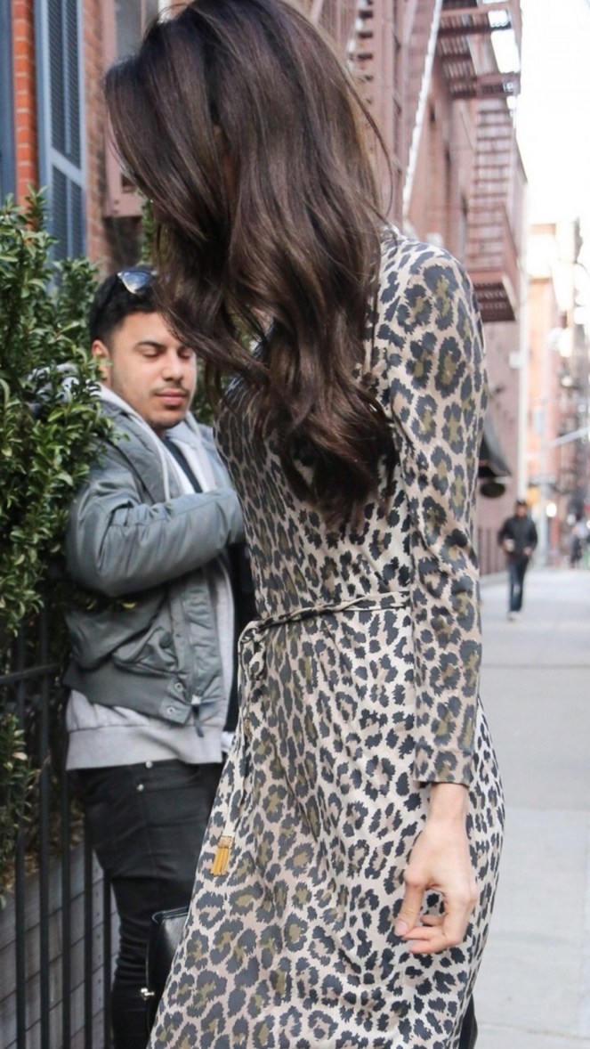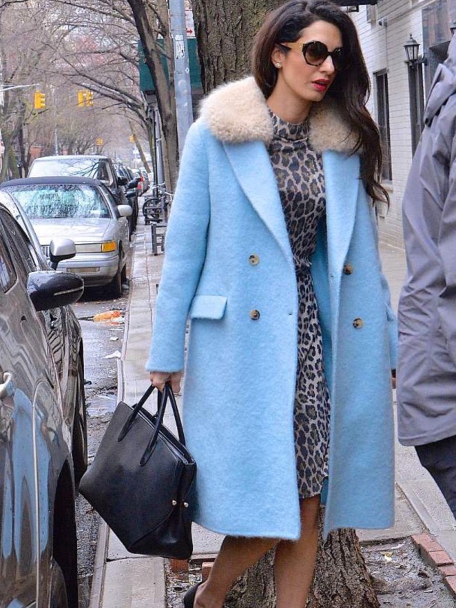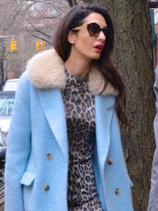 Love everything about this! Leopard print is a classic and this dress seems to fit her well from what I can see. The light blue coat is a bright reminder of spring. She must have 100 coats to never wear the same one twice! But I think this outfit is beautiful!