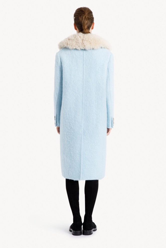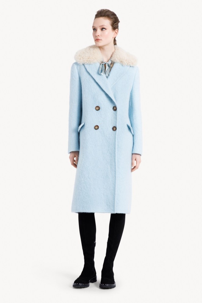 Double-breasted, mohair wool coat with ecru-colour, alpaca fabric collar. The clean cut and relaxed fit make this a truly versatile item, even with jeans, while the collar adds a touch of bon-ton style.