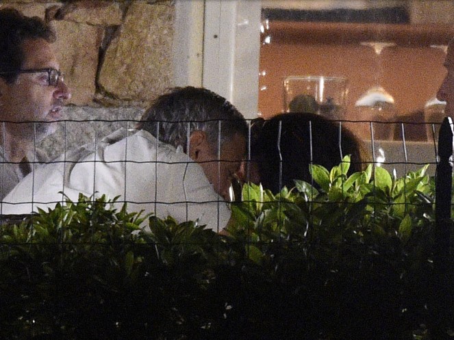 Per multiple photos-here and elsewhere-George & Amal appear to get amorous at Italian restaurants…is there something in the food or maybe the wine? I mean, there are others sitting there-Heslov and George’s ever present body guard-and we still see PDA just like teenagers.