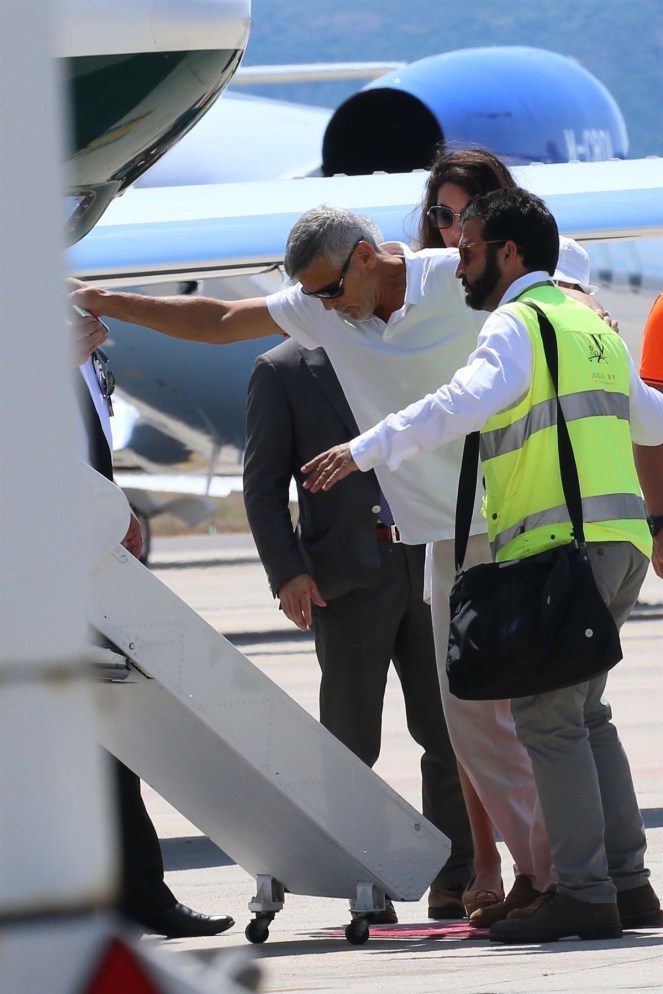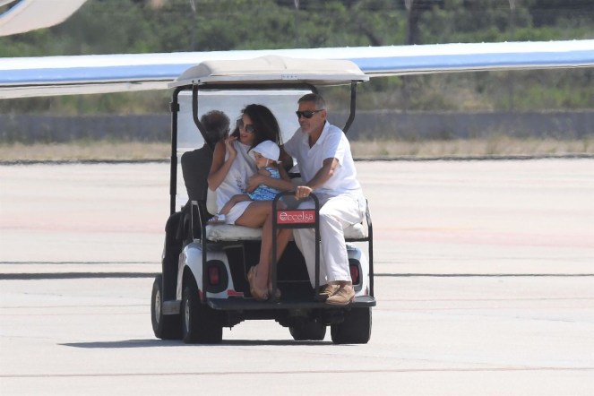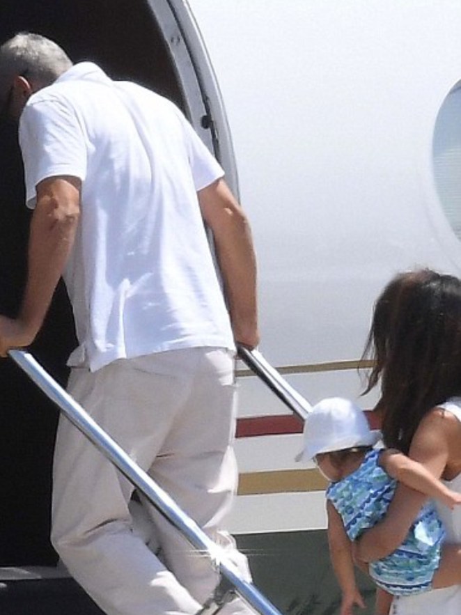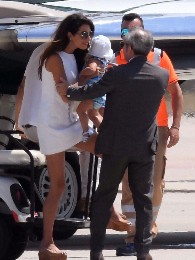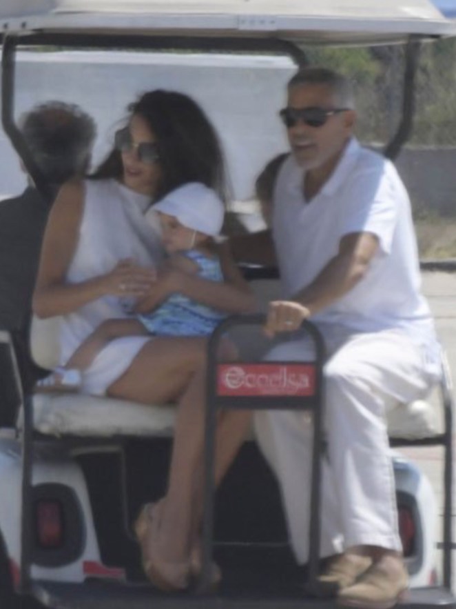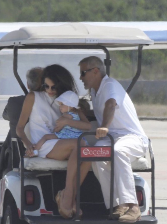 Amal and George Clooney were spotted leaving Sardinia with Ella and Alexander.