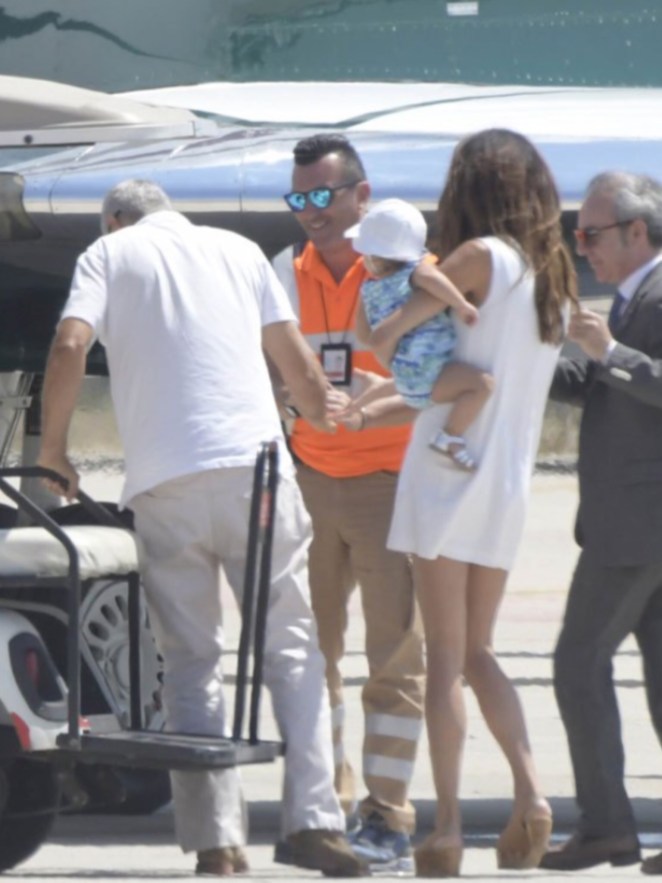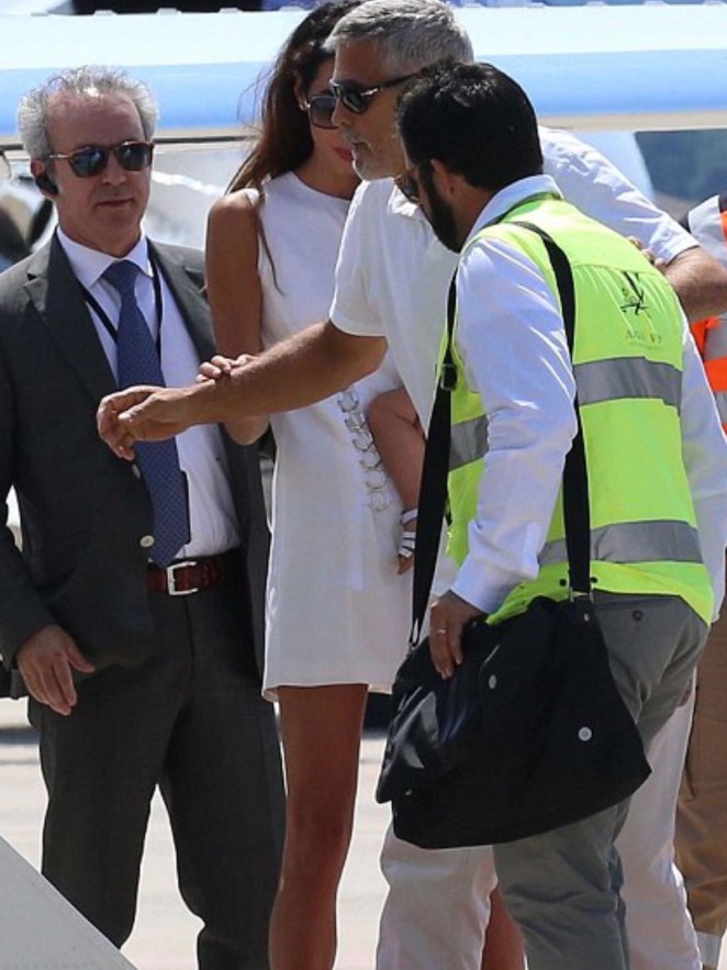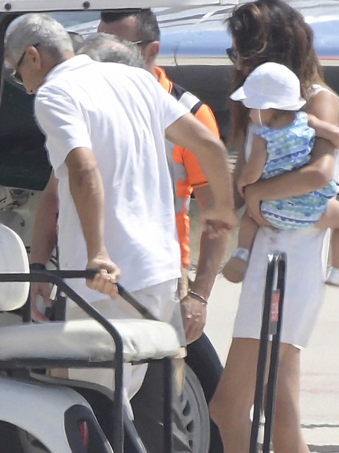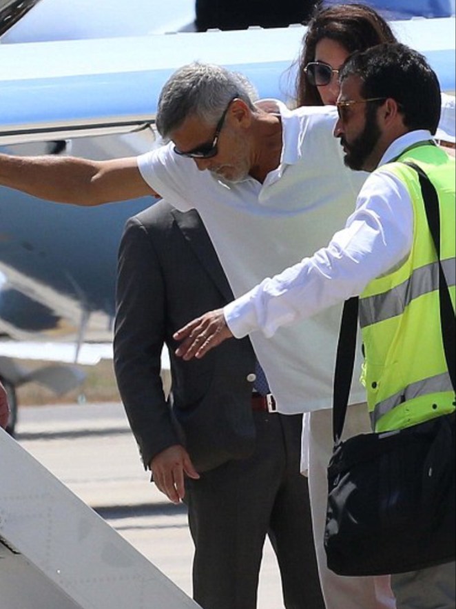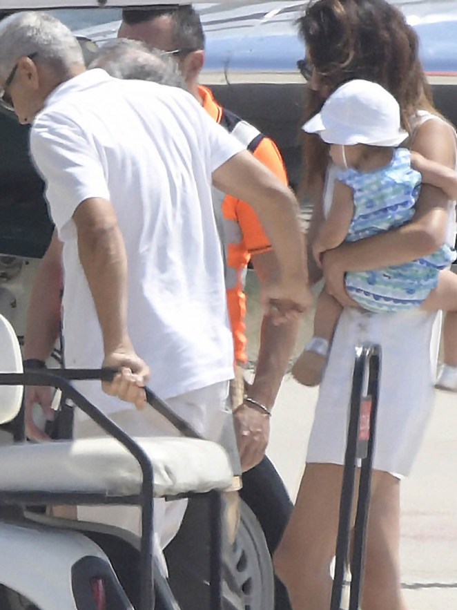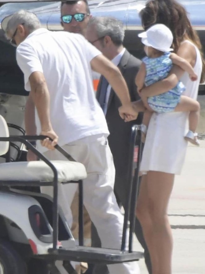 Amal and George Clooney were spotted leaving Sardinia with Ella and Alexander.