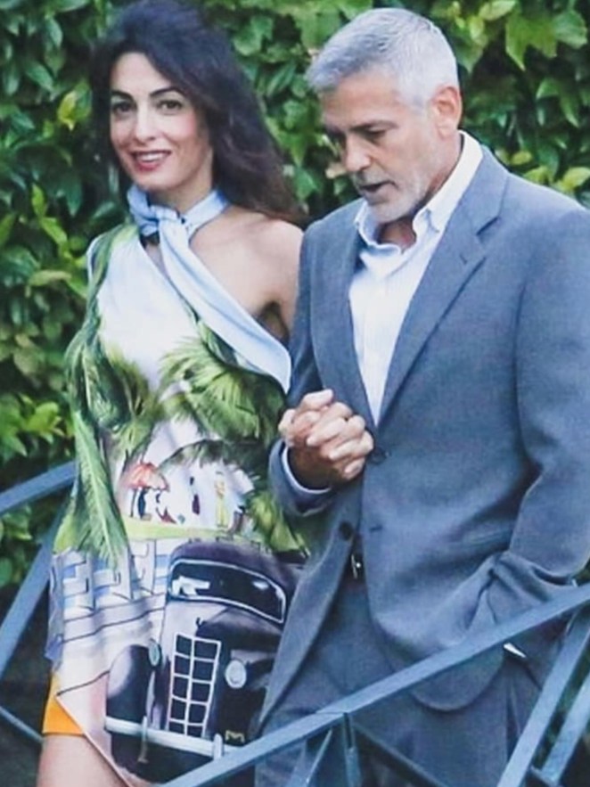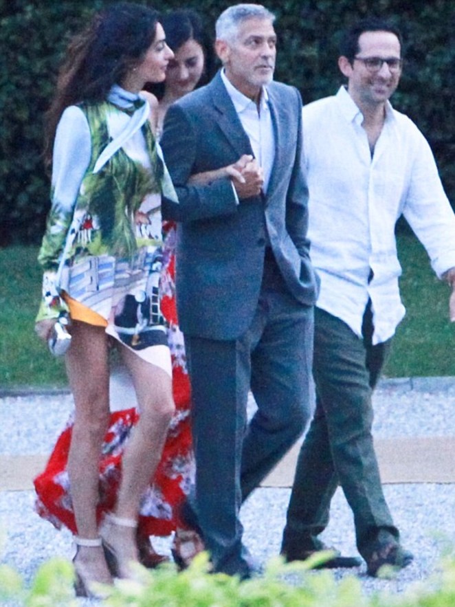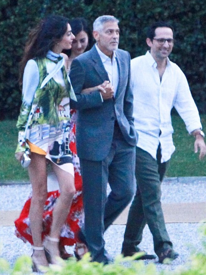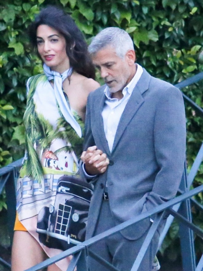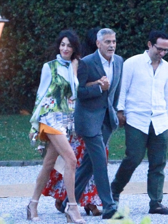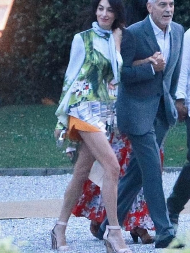 Amal showed off a lot of leg in a pair of orange shorts and a silk blouse-dress while George looked handsome in a gray suit.