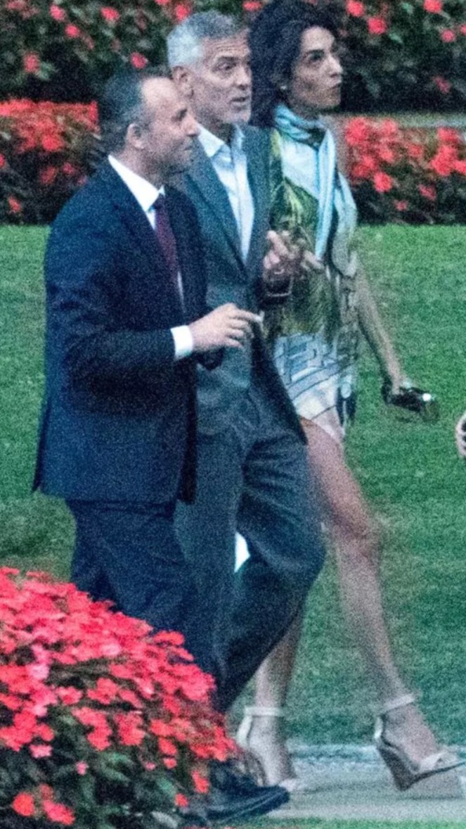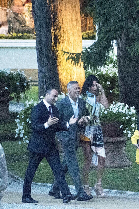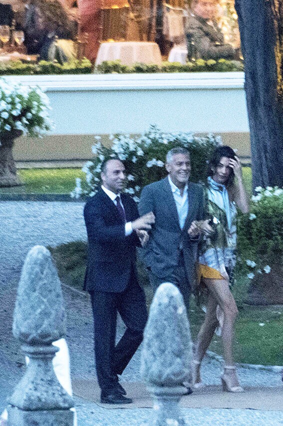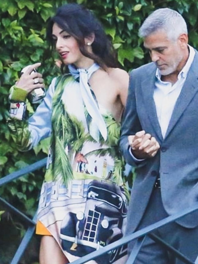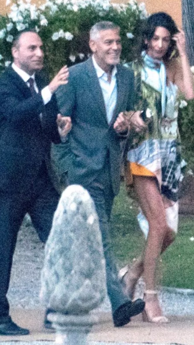 Amal showed off a lot of leg in a pair of orange shorts and a silk blouse-dress while George looked handsome in a gray suit.