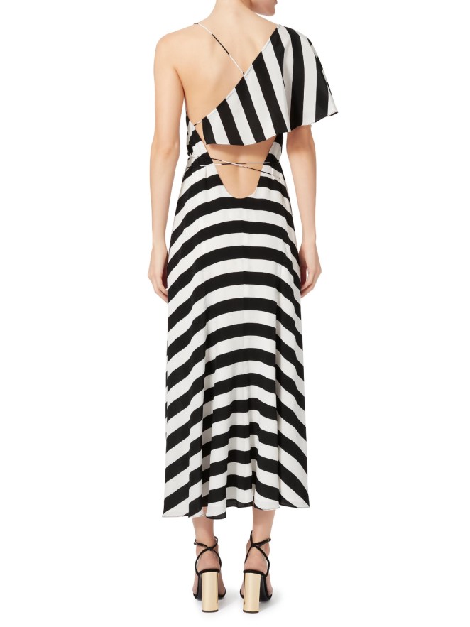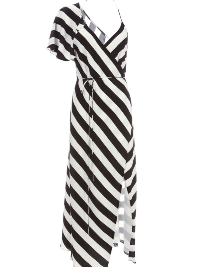 Somehow this dress looked weird but I couldn’t figure out why till it dawned on me: Amal has wrapped the dress the wrong way! In the picture of the pruduct the stripes continue diagonally all the way from top left to he waist. In Amal’s picture the stripes collide on the waist and the stripes coming down from the right take the upper hand. This makes the dress look bulky and ill fitting on Amal.