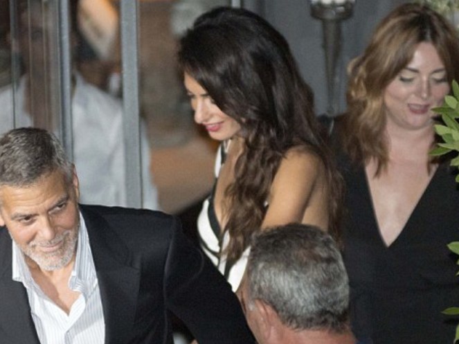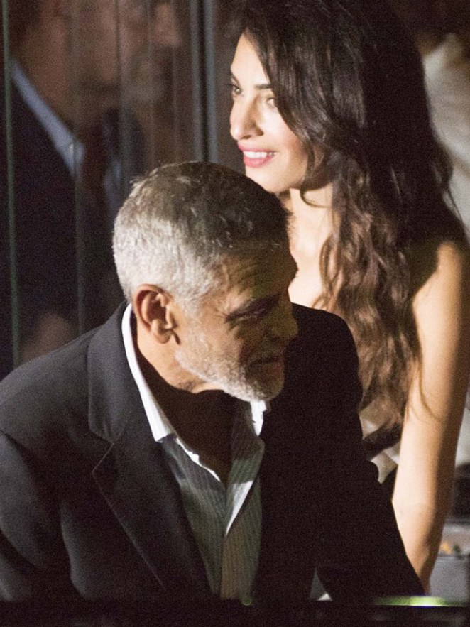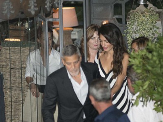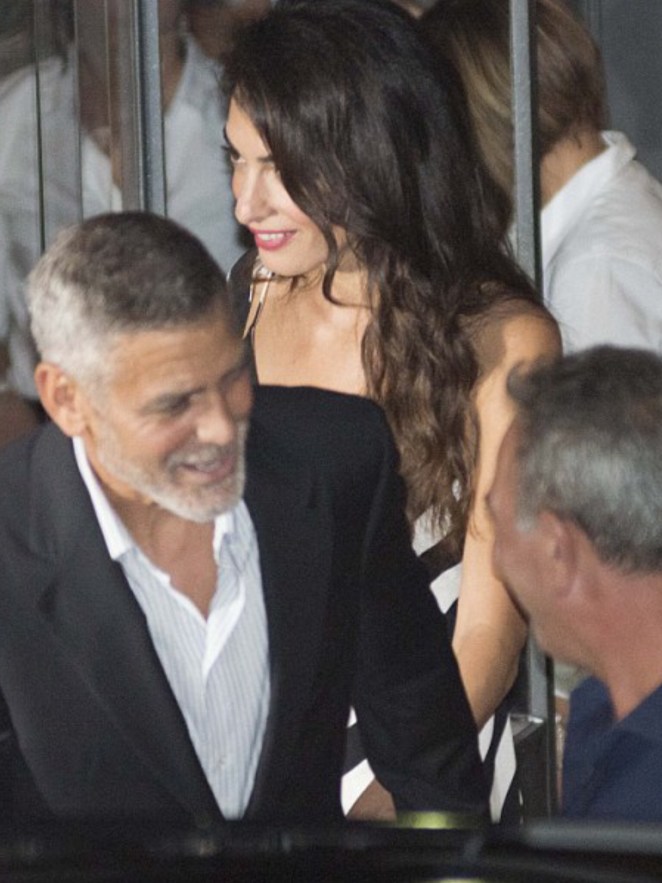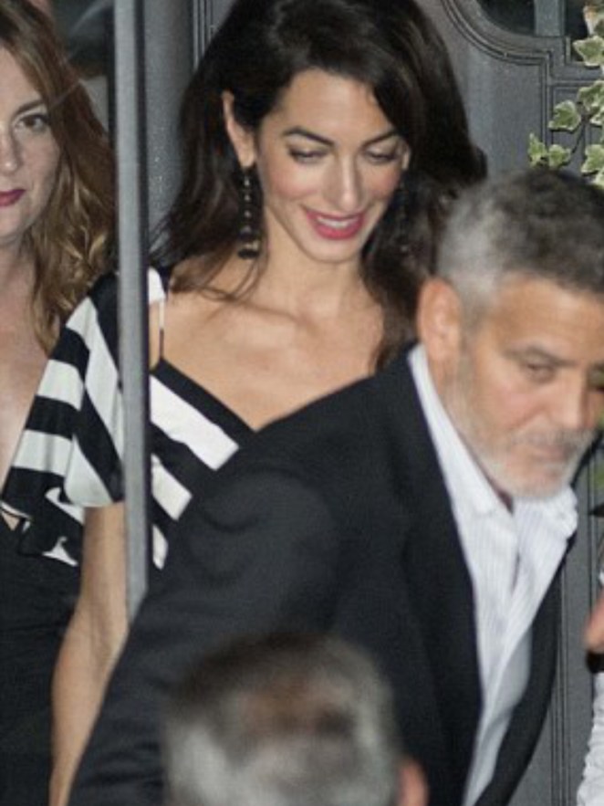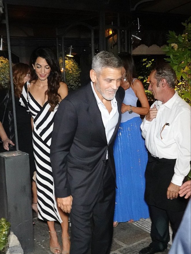 Amal and George Clooney were spotted having dinner with friends at Gatto Nero on Friday night (August 3) in Cernobbio, Italy. Samantha Barry was with them.