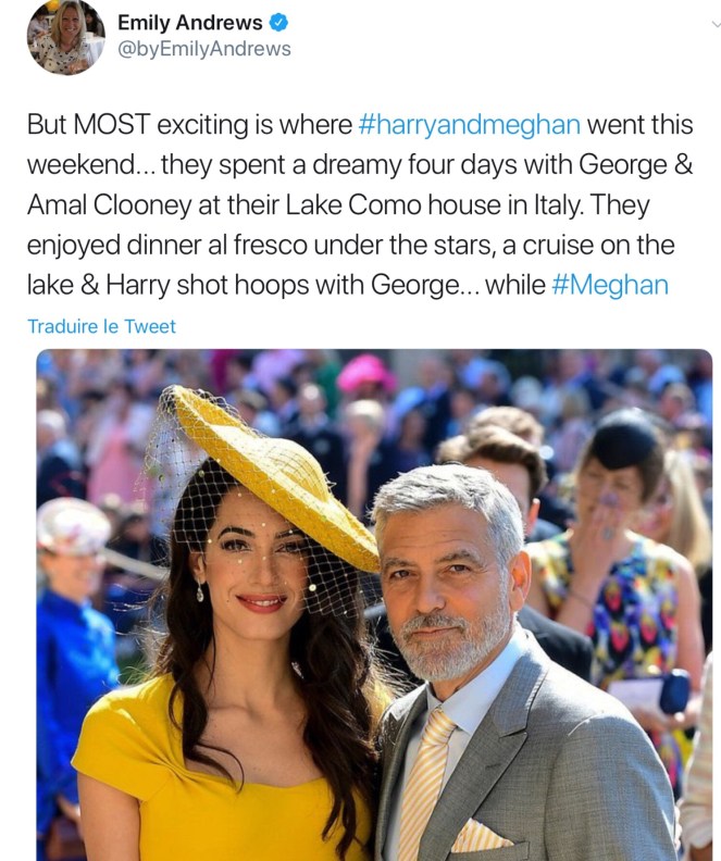 More details have surfaced about Meghan Markle and Prince Harry’s private Italian getaway with George and Amal Clooney in Lake Como this weekend. In addition to bonding at the Clooneys’villa in Laglio, the Duke and Duchess of Sussex also enjoyed hangouts by the pool, a private cruise, and indulgent dinners, Chi magazine reports. George even showed off his motorcycle collection to Harry and played him in a basketball game.