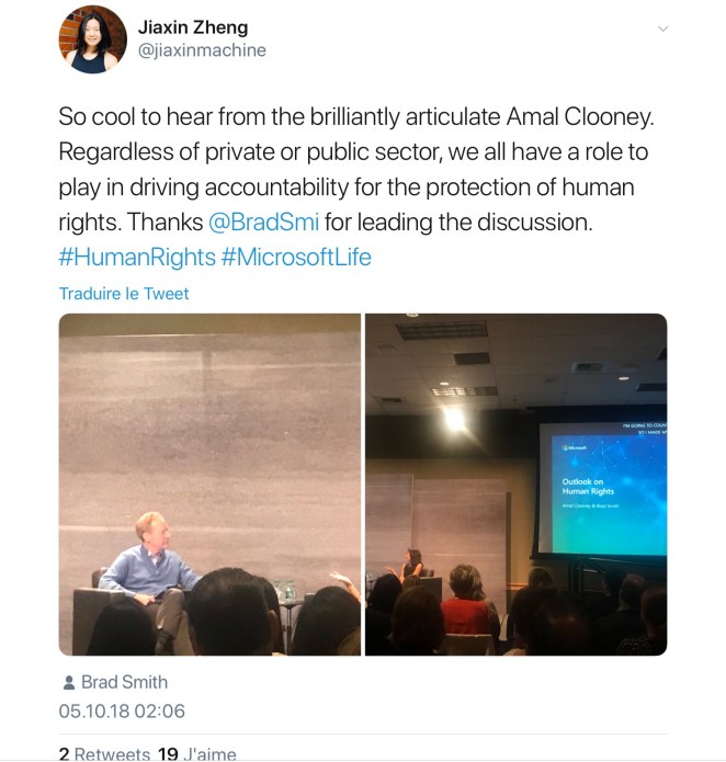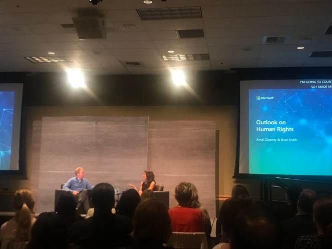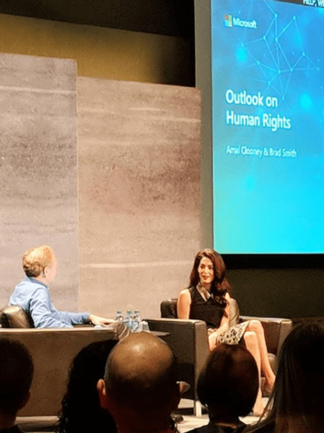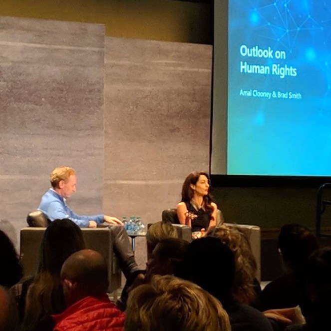 Amal Clooney took part in Microsoft Life event “Outlook on Human Rights” to talk about her important work in International Law and human rights with Brad Smith, Microsoft president, on October 5th, 2018 in Washington.