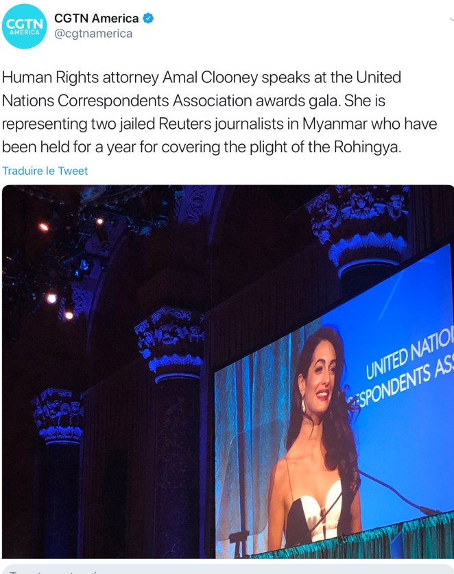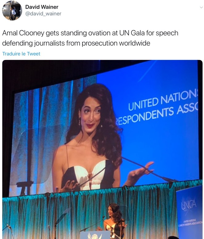 1. So, I listened to Amal’s complete speech and would like to comment. Amal said in so many words that Trump is connected with the death of Jamal Khashoggi, She used the phrase “green light”. That is absurd and a remarkably dangerous thing to suggest. Trump has been railing about the press for a long time. He goes after whomever reports something he doesn’t like. But,Trump is correct in bringing the topic of lack of quality in journalism to the table.Recently journalists themselves have begun discussing this topic. Mr,Khashoggi was killed two months ago and neither Amal nor the Clooney Foundation made any statement at all condemning this. And, although she specifically criticized the current US President in her speech, she made no mention of heads of state of Turkey, Saudi Arabia, China etc, that routinely arrest & torture journalists. For her to call out Trump who at the most has banned a CNN reporter from the WH briefings and not call out the true scoundrels really says a lot about her and it is not good. I also have to say that a good deal of her speech included listing all of her cases; she appeared to be using this opportunity as a commercial for her work. Lastly, in the same video that contained her speech there was extensive film of her talking with the UN Sec Gen. Amal turns her back to George and ignores him for a long time-when this happens, the look on George’s face is priceless-and Amal continues to focus on the Sec. Gen. who actually looks bored!