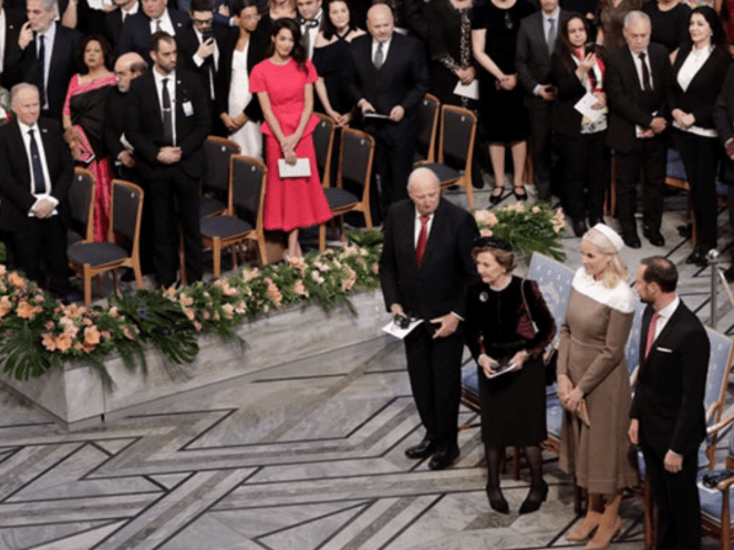 Joining the Crown Prince and Princess of Norway, Clooney is present for the prestigious award at City Hall in Oslo, Norway.