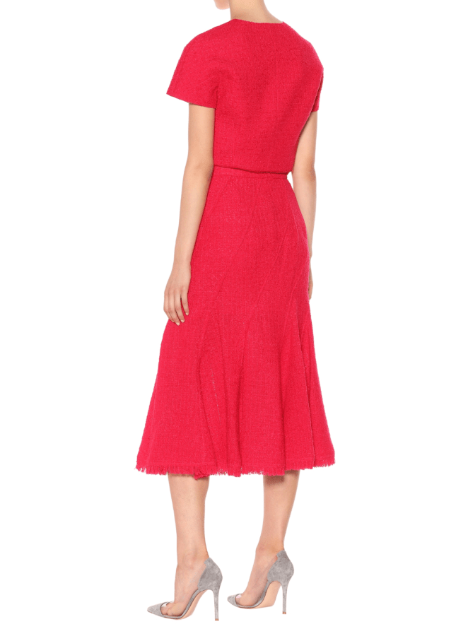 For the ceremony today, Amal Clooney is wearing an Oscar De La Renta tweed shirt and skirt co-ord, which she’s paired with a nude suede heel by Jimmy Choo.